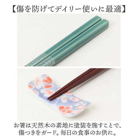 | 素材 | 【箸】 ・天然木 [表面塗装・上部]アクリルウレタン塗装 [表面塗装・下部]漆塗装 【箸置き】 ・陶器 |