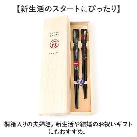 商品説明【いつもの食卓が上質な空間に】艷やかで上品な風合いが、食卓に彩りをプラス。「一双 夫婦箸ギフトセット」が新登場。【何層にも漆を重ねた伝統の若狭塗】福井県小浜市産、伝統工芸品の漆器。一層、二層、三層と、匠の想いを丁寧に重ね「一双」に。【傷を防げてデイリー使いに最適】天然木の素地に塗装を施すことで、傷つきをガード。毎日の食事のお供に。【食材をしっかりキャッチ】箸先には、滑り止め加工済み。食材をつかみやすい仕上がり。【食洗機対応でお箸を簡単お手入れ】食洗機の使用OK。お手入れしやすく、忙しい毎日の味方。【新生活のスタートにぴったり】桐箱入りの夫婦箸。新生活や結婚のお祝いギフトにもおすすめ。