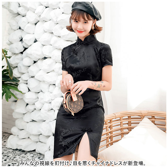 チャイナドレス ショット丈 j308lgd145【1455ブラック】【Mサイズ】