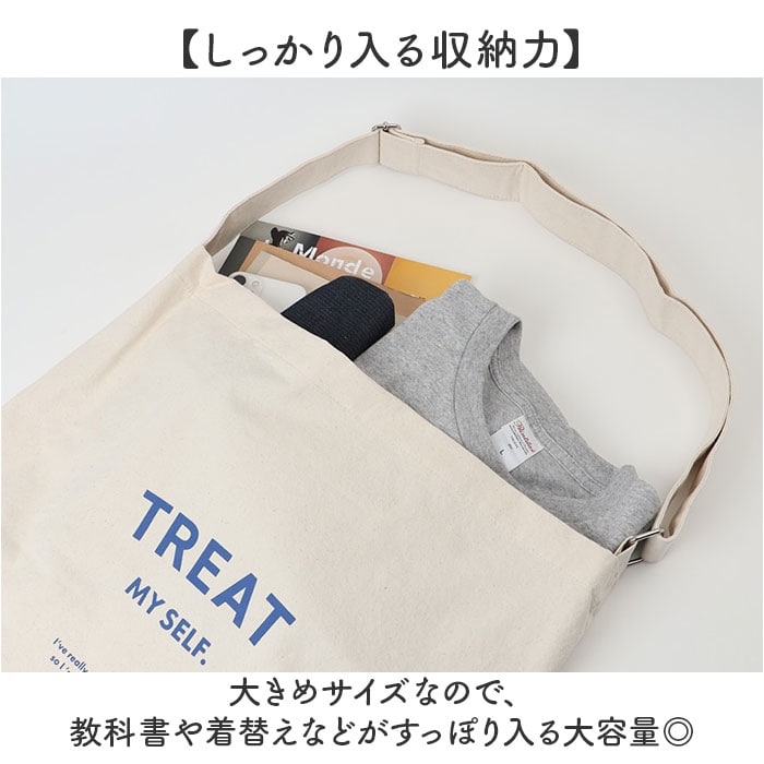| 商品説明 | 【デイリーに活躍】丈夫なキャンバス素材で大容量、毎日使いたくなるTREATショルダー。【しっかり入る収納力】大きめサイズなので、教科書や着替えなどがすっぽり入る大容量◎【軽やかキャンバス地】コットン100%の丈夫なキャンバス素材だから毎日使っても安心〇【両手が空いてストレスフリー】長さ調節可能なショルダーベルトで、肩掛けも斜め掛けもできて便利♪【ワンタッチ開閉】開口部は片手でサッと開閉できるマグネットボタン式。大きく開いて、出し入れラクラク。【マチ広でたっぷり入る】底マチがゆとりのある設計で、お弁当箱や水筒も安心して持ち運べる。【コーデのアクセントに】フロントのビッグロゴがアクセント!カジュアルスタイルにこなれ感をプラスしてくれる! |