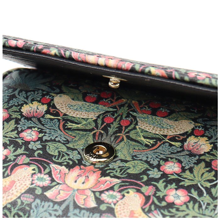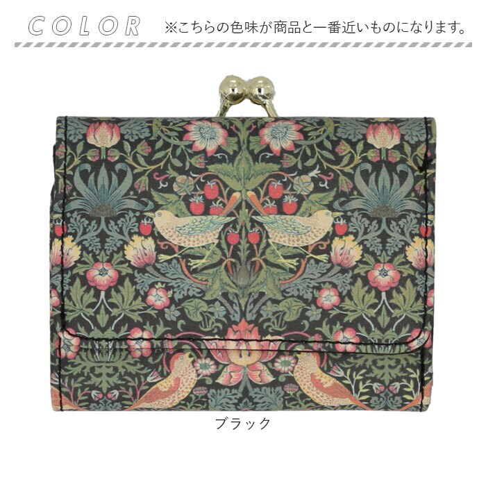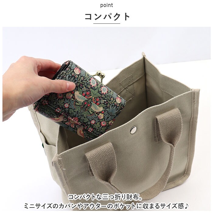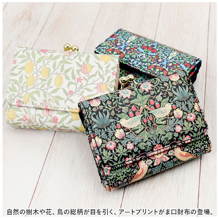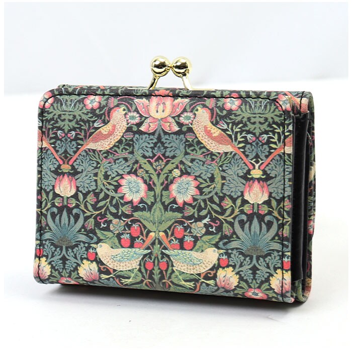 | 商品説明 | 自然の樹木や花、鳥の総柄が目を引く、アートプリントがま口財布の登場。【ウィリアムモリス×JOUET】「生活に必要なものこそ美しくあるべき」をモットーとするテキスタイルで有名な「ウィリアムモリス」と、バッグブランド「JOUET」のコラボデザイン。【上品さと可愛さ】自然の樹木や花、鳥の総柄デザインがどこかレトロな印象で、持っているだけで暮らしの一部を豊かな気分にさせてくれるアイテム♪落ち着いたカラーでゴールドの金具とマッチして上品さと可愛さが融合。【コンパクト】コンパクトな三つ折り財布。ミニサイズのカバンやアウターのポケットに収まるサイズ感♪【カードポケット充実】フラップ内側にカードポケットを配置。普段使うポイントカードやクレジットカードもしっかり収納。【コインケース付き】現金派にも嬉しいコインケース付き。がま口とガバッと大きく開く折りマチ構造で小銭の出し入れがスムーズに。【こだわり】小さくても、美しいデザインをそのままに。正面は絵柄に合わせて縫製。【ポケット仕様】フラップ内側・・・カードポケット×4、フリーポケット×1、お札入れ×1コインケース・・・収納ルーム×2 |