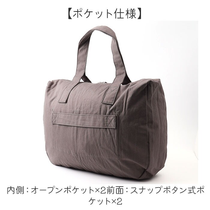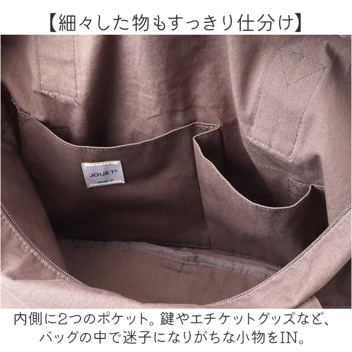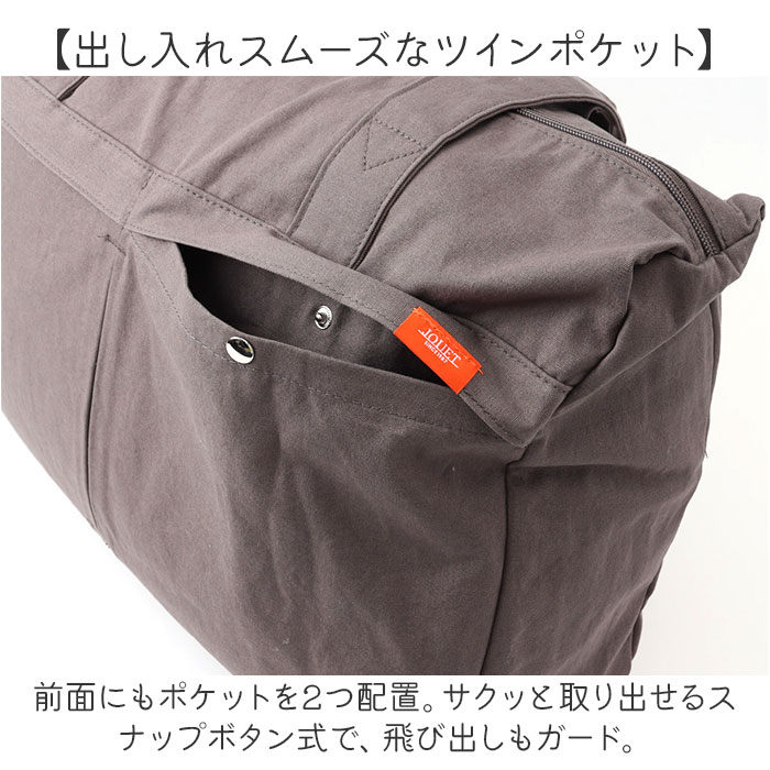 | 商品説明 | 【旅行やレジャーの頼りになる相棒】荷物がざっくりひとまとめ◎ラフに持ち歩ける「ツインポケットビッグトート」。【ガシガシ使える丈夫なコットン製】柔らかくチュラルな風合いながら、耐久性のある素材。長く愛用できるのが嬉しい!【肩掛けできて移動がラクラク】ハンドルはアウターの上からも、肩に掛けられる長さに設計。荷物が重くなっても大丈夫。【ガバっと開くダブルファスナー】左右どちらからもオープン。中身を確認しやすく、ファスナーを閉じればプライバシーを確保。【ざっくりまとまる大きめサイズ】B4が収まる大きさ。程よいマチと広めの横幅で、衣類やタオル、コスメポーチなども収納可能。【細々した物もすっきり仕分け】内側に2つのポケット。鍵やエチケットグッズなど、バッグの中で迷子になりがちな小物をIN。【出し入れスムーズなツインポケット】前面にもポケットを2つ配置。サクッと取り出せるスナップボタン式で、飛び出しもガード。【キャリーオンOKで移動もスマート】背面のループを、キャリーのハンドルに差し込めるキャリーオンタイプ。【お揃いOK☆ユニセックスデザイン】シンプルなワンカラーに、JOUETタグがアクセント。家族やカップルでお揃いやシェアも♪【ポケット仕様】内側:オープンポケット×2前面:スナップボタン式ポケット×2 |