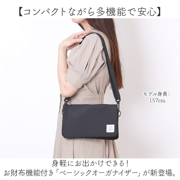 | 商品説明 | 【コンパクトながら多機能で安心】身軽にお出かけできる!お財布機能付き「ベーシックオーガナイザー」が新登場。【スリム&コンパクトで使い勝手抜群】お出かけ時にサッと持ち出せるサイズ感。貴重品がすっきりひとまとめ。【両手が空いてストレスフリー】長さ調節可能なショルダーを取り付けて、斜め掛け。アクティブシーンでも快適。【開閉スムーズ、安心の天ファスナー】ガバっと開いて取り出しやすく、ファスナーを閉じればプライバシーを確保。【仕分けしやすい5ルーム仕様】内側には5つの収納ルーム。整理整頓しやすく、中身を確認しやすいつくり。【お財布代わりに使えて便利】中央ルームには複数ポケット。最低限の現金やカードを入れておけて、キャッシュレス派に最適。【カジュアルスタイルにマッチ】サラッと軽いポリエステル生地に、ロゴタグがアクセント。ラフなスタイルに馴染む仕上がり。【メインもサブ使いもできて万能】お散歩やちょっとしたお買い物にはこれ1つで。レジャーや旅行のサブバッグとしても活躍☆【不意の雨などにも対応できて丈夫】撥水性があり、ガシガシ使える素材。お手入れも拭き取るだけ。(※)防水加工ではないため、縫い目から浸水する恐れがあります。濡れたらすぐに拭き取ってください。【お気に入りを選べるカラー】コーデに合わせやすい、落ち着きのあるカラーバリエーション。飽きが来ず、長く愛用◎【ポケット仕様】内側中央スペース:ファスナー式メッシュポケット×1、カードポケット×6 |