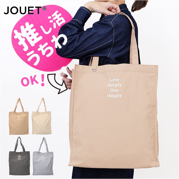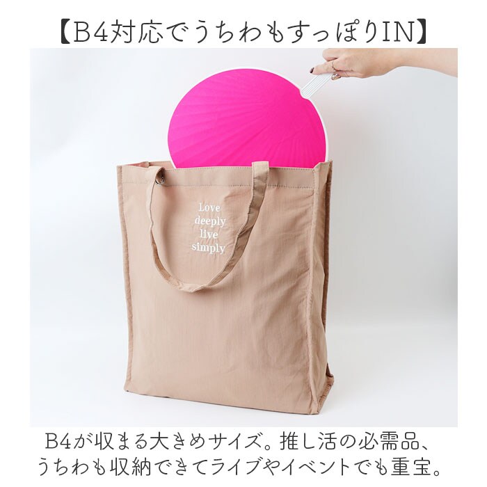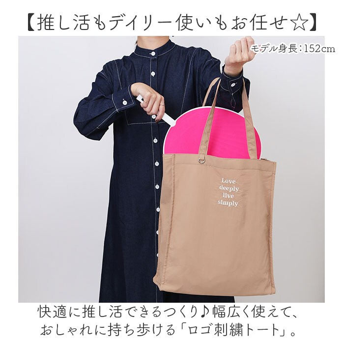 | 商品説明 | 【推し活もデイリー使いもお任せ☆】快適に推し活できるつくり♪幅広く使えて、おしゃれに持ち歩ける「ロゴ刺繍トート」。【大人女子にぴったりなデザイン】シンプルなワンカラーに、ロゴ刺繍がアクセント☆仕事や学校後にそのまま現場へ直行も!【肩掛けできて移動がラクラク】アウターの上からも、肩掛けできるハンドル。両手を自由に使えて、荷物が重くなっても大丈夫。【マグネットボタンでワンタッチ開閉】力いらずで簡単◎ガバっと開いて出し入れしやすく、閉じれば中身のこぼれ落ちもガード。【B4対応でうちわもすっぽりIN】B4が収まる大きめサイズ。推し活の必需品、うちわも収納できてライブやイベントでも重宝。【たるみにくく安定感もキープ】取り外し可能な底板付き。バッグの型崩れを防げて、安定した状態で持ち運びOK。【サクッと取り出せて迷子知らず】大きめのファスナーポケットと、ペンライトやペットボトルが入るサイドポケットを装備◎(※1)ファスナーポケットにもうちわを収納できますが、うちわのサイズによっては入らない場合もあります。【不意の雨に対応できる撥水性】バッグには汚れや水滴を弾きやすい、撥水加工済み。お手入れも拭き取るだけ。(※2)防水仕様ではないため、縫い目から浸水する可能性があります。濡れた場合は、すぐに拭き取ってください。【オリジナルのアレンジも自在】フロントのDカンに、お気に入りのチャームなどを取り付け!自分だけのバッグに☆【お気に入りを選べるカラー】コーデにも合わせやすい、落ち着きのあるカラーをラインナップ。仲間とお揃いも♪【ポケット仕様】内側:ファスナーポケット×1、サイドポケット×1 |