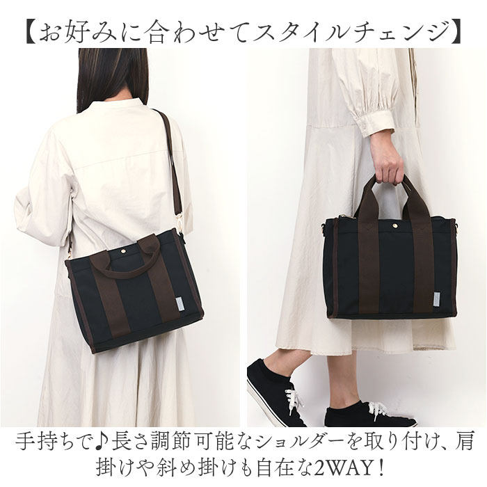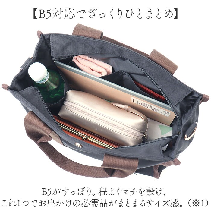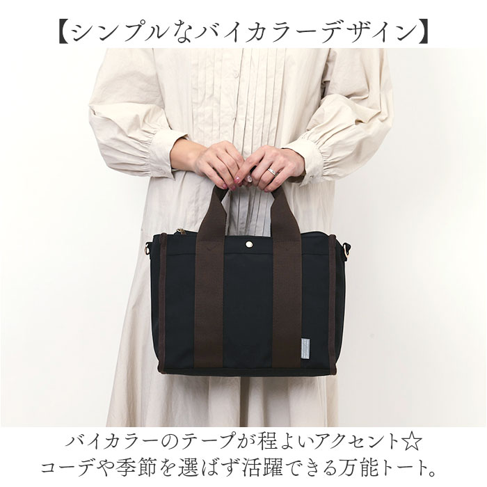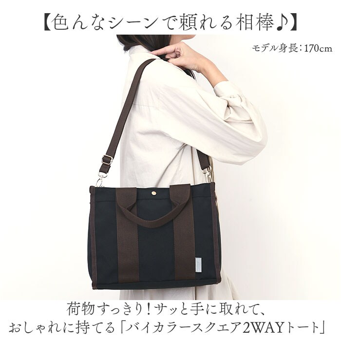 | 商品説明 | 【色んなシーンで頼れる相棒♪】荷物すっきり!サッと手に取れて、おしゃれに持てる「バイカラースクエア2WAYトート」。【シンプルなバイカラーデザイン】バイカラーのテープが程よいアクセント☆コーデや季節を選ばず活躍できる万能トート。【お好みに合わせてスタイルチェンジ】手持ちで♪長さ調節可能なショルダーを取り付け、肩掛けや斜め掛けも自在な2WAY!【開閉スムーズ。安心の天ファスナー】メインルームはガバっと開いて出し入れ簡単。ファスナーを閉じれば、プライバシーも確保。【B5対応でざっくりひとまとめ】B5がすっぽり。程よくマチを設け、これ1つでお出かけの必需品がまとまるサイズ感。(※1)A4サイズを収納すると角が折れる可能性が高いため、B5サイズ推奨です。【サクッと取り出せて迷子知らず】合計3つのポケットを配置。ボトルが倒れず、使用頻度の高い物もバッグの中で探す手間が不要。【不意の雨に対応できる撥水性】バッグには汚れや水滴を弾きやすい、撥水加工済み。お手入れも拭き取るだけ。(※2)防水仕様ではないため、縫い目から浸水する可能性があります。濡れた場合は、すぐに拭き取ってください。【落ち着きのあるカラーリングも魅力】大人の女性にぴったりなカラーをラインナップ。休日はもちろん、通勤にもおすすめ!【ポケット仕様】内側:オープンポケット×2、ボトルポケット×1 |