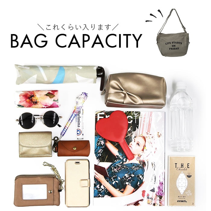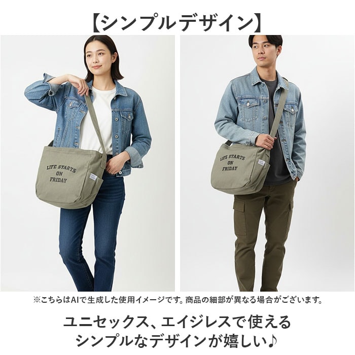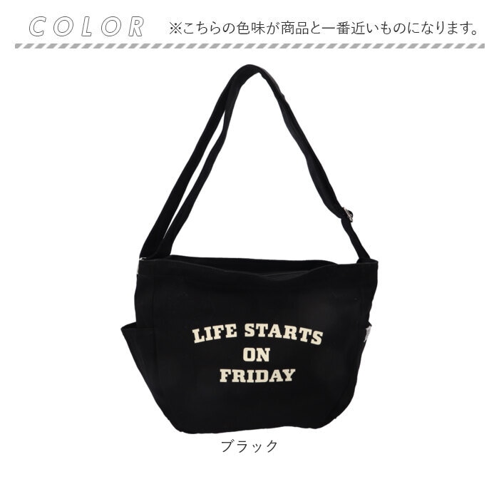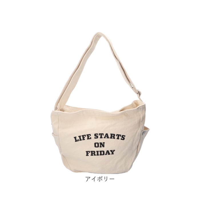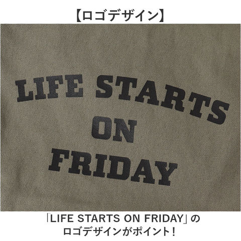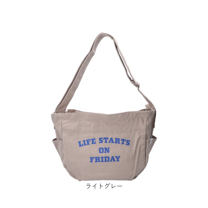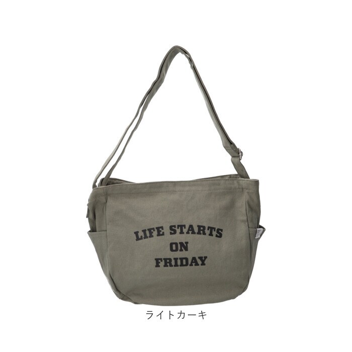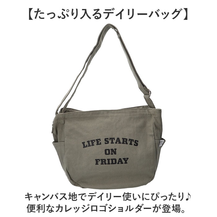 | 商品説明 | 【たっぷり入るデイリーバッグ】キャンバス地でデイリー使いにぴったり♪便利なカレッジロゴショルダーが登場。【大きく開いて使いやすい】ガバッと開くから必要なものをサッと取り出しやすい♪【A4も楽々収納】書類や雑誌がすっぽり入る大きめサイズで荷物が多い日も安心◎【便利なポケット】小物を整理しやすい内ポケット2つと、両サイドにはペットボトルが入るオープンポケットを2つ配置〇【2way仕様】長さ調節可能なショルダーベルトで、肩掛けも斜め掛けも自由にスタイルチェンジ♪【耐久性のある生地感】丈夫なコットンキャンバスで毎日気兼ねなく使えて長く愛用できる◎【ロゴデザイン】「LIFE STARTS ON FRIDAY」のロゴデザインがポイント!【シンプルデザイン】ユニセックス、エイジレスで使えるシンプルなデザインが嬉しい♪ |