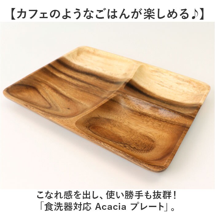 | 商品説明 | 【カフェのようなごはんが楽しめる♪】こなれ感を出し、使い勝手も抜群!「食洗器対応 Acacia プレート」。【独特な風合いが魅力のアカシア】独特な模様と濃淡が楽しい木目♪盛り付けるだけで見栄えもアップし、温かみのある食卓を演出。(※)天然木を使用しているため、個体差があります。【ワンプレートランチが完成☆】主菜、副菜、デザートなどをバランス良く盛り付けできる3つの仕切り。おしゃれな時短ランチ♪【軽くて割れにくくお子さまにも】サッと手に取りやすく、万が一落としてしまっても割れにくい!お子さまのご飯にも♪【汁気のあるメニューにも対応】やや深さがあるので、少し汁気のあるおかずやパスタなどもOK。【表面塗装済みで毎日使いに最適】自然な質感はそのままに、表面塗装をプラス。汚れや傷がつきにくいのが嬉しい◎【食洗機に任せて、ひとやすみ】耐水性のある加工を施し、家庭用食洗機に対応。洗い物時間を減らせて、忙しい毎日の味方!【耐久性があり、アウトドアなどでも】硬く耐久性に優れ、腐りにくいアカシア素材。キャンプなどのアウトドアでも重宝。【使いやすいスクエアプレート】配膳しやすく扱いやすいスクエア型。どこか懐かしさを感じる木の器で、暮らしをもっと豊かに♪ |