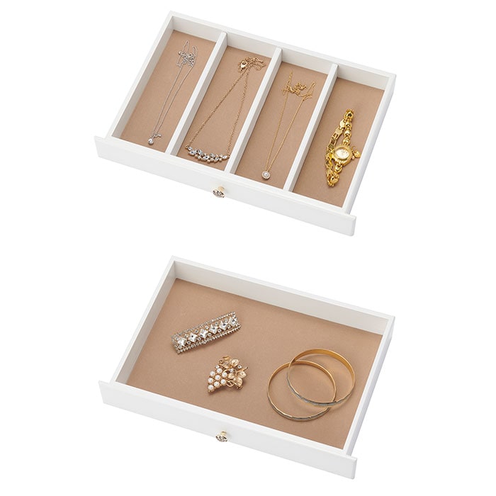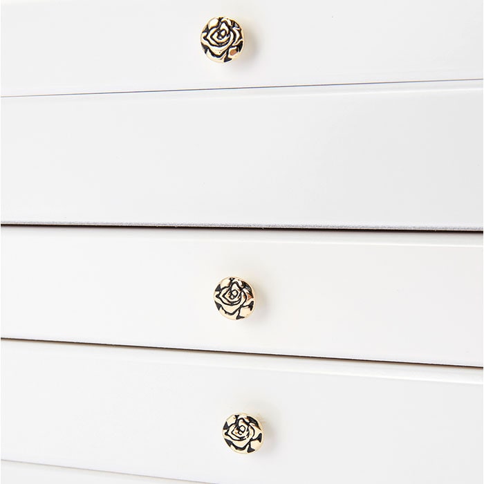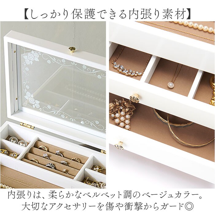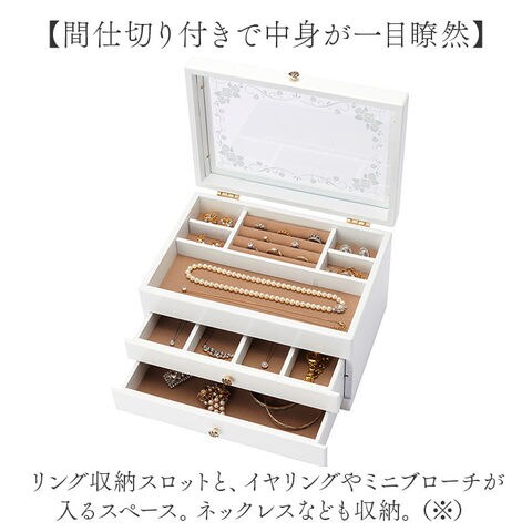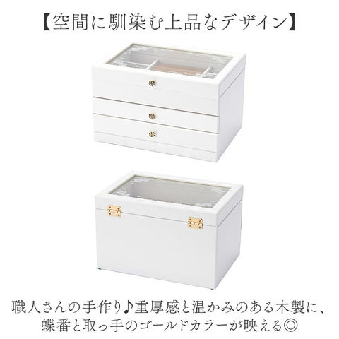 | 商品説明 | 【大切なアクセサリーをすっきり整頓】おしゃれに見やすく保管できる!上質な日本製「木製ジュエルケース」。【空間に馴染む上品なデザイン】職人さんの手作り♪重厚感と温かみのある木製に、蝶番と取っ手のゴールドカラーが映える◎【サッと開閉できて取り出しスマート】・1段目は蝶番を持って、そのままオープン。2段目と3段目は引き出し式。【間仕切り付きで中身が一目瞭然】リング収納スロットと、イヤリングやミニブローチが入るスペース。ネックレスなども収納。(※)仕切りは全て取り外し不可です。【腕時計や大ぶりアイテムをIN】・2段目は仕切り付きスペース、3段目は完全フリー。バングルや腕時計などもざっくりと。【しっかり保護できる内張り素材】内張りは、柔らかなベルベット調のベージュカラー。大切なアクセサリーを傷や衝撃からガード◎【大切な方へのギフトにもおすすめ】ホワイトカラーに、ガラスの天板には花柄プリント。長く愛用できるデザインで贈り物にも♪【収納スペース】・1段目:リングスロット×3、ミニフリースペース×4、フリースペース×1・2段目:フリースペース×4・3段目:フリースペース×1 |