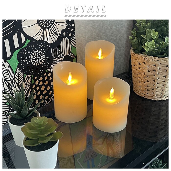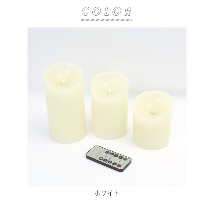 | サイズ | ・キャンドルライト(Sサイズ) [縦]約10cm/[直径]約8cm ・キャンドルライト(Mサイズ) [縦]約13cm/[直径]約8cm ・キャンドルライト(Lサイズ) [縦]約15cm/[直径]約8cm ・リモコン [縦]約9cm/[横]約4cm/[厚み]約1cm ※サイズは当店平置き実寸サイズです。実際の商品とは多少の誤差が生じる場合がございます。あらかじめご了承ください。 |