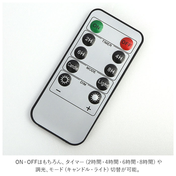| 注意点 | [キャンドルライト使用電池]単3形乾電池使用(電池は別売りです)(※キャンドルライト1本当たり、2本の単3形乾電池を使用します。[リモコン使用電池]ボタン型電池(CR2025)1個使用。(※お試し用電池が付属しています。)海外輸入品のため、パッケージや説明書の表記は英語と中国語を併記したものが添付されております。商品を安価でご提供させていただくため、輸入時のパッケージのままでのお届けとなります。予めご了承くださいませ。海外輸入品のため、パッケージに破れ、傷やへこみがある場合がございます。本体には問題ございませんので、予めご了承くださいませ。商品の写真はできる限り実物のお色に近づけるように加工しておりますが、お使いのモニター設定、お部屋の照明などにより、実際の商品と異なる場合がございます。商品や個体差などにより、表記と若干異なる場合がございますが、予めご了承くださいませ。採寸方法の違いにより、多少の誤差がある場合がございます。 |