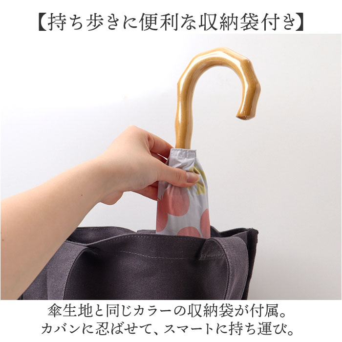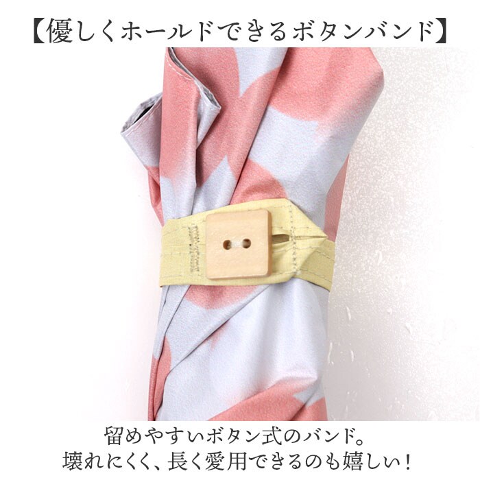 | 商品説明 | 【お出かけの頼れる相棒に♪】晴れの日も雨の日も使える兼用タイプ。「サントス wacco 晴雨兼用 2段折傘」。【抜群の遮光効果で晴れた日の味方】遮光率99.99%、UVカット率99.9%!内側PUコーティングで、紫外線をカット。【お天気が不安定な日にも対応】耐水性もあり、ちょっとの雨なら大丈夫。突然のお天気急変にも慌てない◎【いつでもどこでもイージーオープン】傘骨をポキポキ折る手間なく、スムーズに開閉できる2段骨の手開き仕様。【安心・安全のセーフガード付き】爪や指を挟むのを防止するカバーを装備。開閉時のケガを防ぎ、ネイルを施した爪も保護。【しなやかで丈夫なグラスファイバー】親骨先端は、弾力性があり折れにくいグラスファイバー。【優しくホールドできるボタンバンド】留めやすいボタン式のバンド。壊れにくく、長く愛用できるのも嬉しい!【サクッと持ち歩ける軽量設計】軽量な生地を使用し、お出かけの負担にならない!デイリーに持ち歩けるアイテム。【手に馴染むピーナッツハンドル】サッと持ちやすいぽこぽこ形状。ナチュラルな風合いがアクセントに。【持ち歩きに便利な収納袋付き】傘生地と同じカラーの収納袋が付属。カバンに忍ばせて、スマートに持ち運び。【気持ちが晴れやかになるデザイン】シーンを問わず使えて、気分も上がる♪上品なデザインをラインナップ。 |
