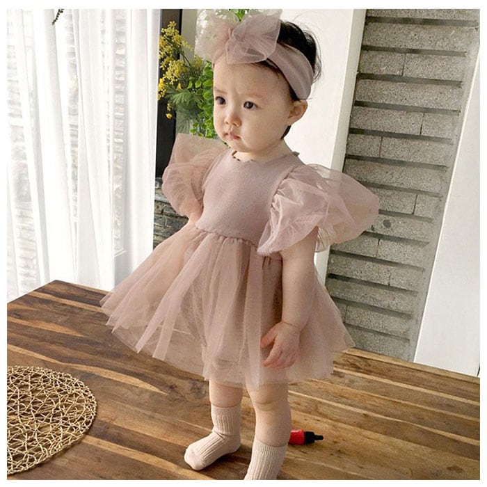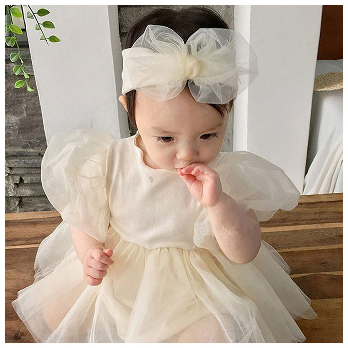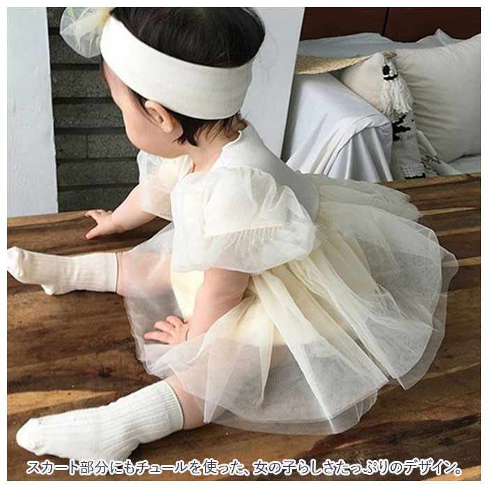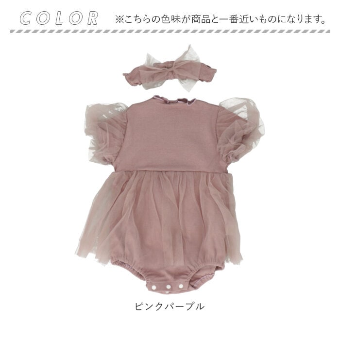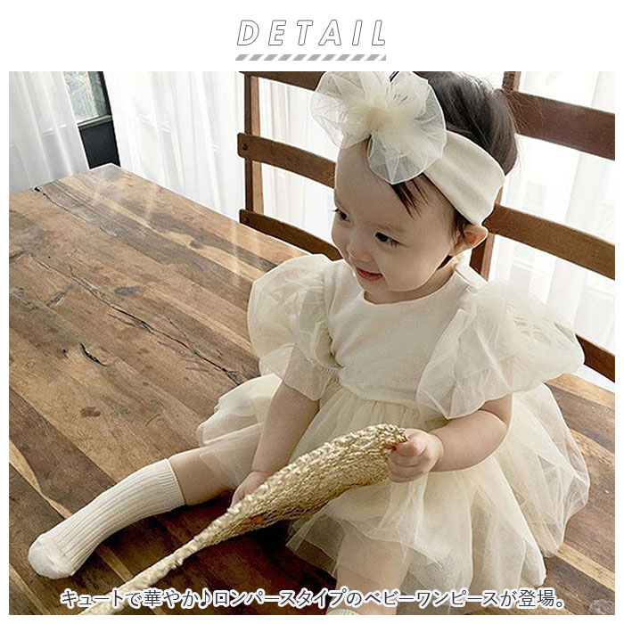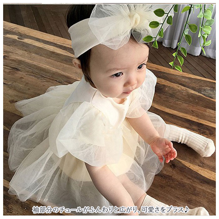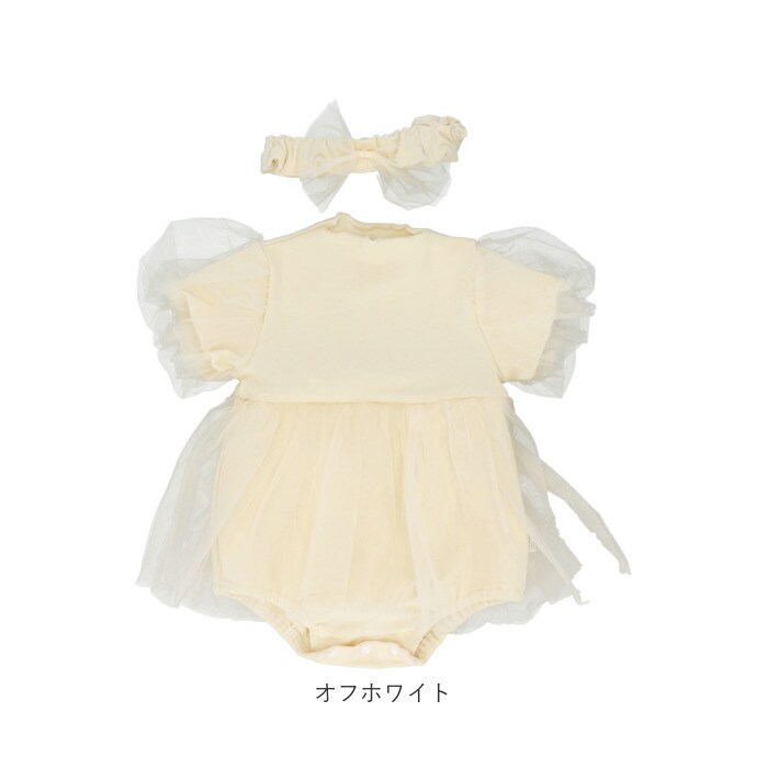 | 商品説明 | キュートで華やか♪ロンパースタイプのベビーワンピースが登場。袖部分のチュールがふんわりと広がり、可愛さをプラス♪スカート部分にもチュールを使った、女の子らしさたっぷりのデザイン。お肌に直接当たる部分は、柔らかく伸縮性のある素材を使用。デリケートな赤ちゃんのお肌に優しいつくり◎股部分にスナップボタン付きで、おむつ替えもラクラク。付属のヘアバンドと合わせて、おしゃれにコーディネート♪お誕生日やお宮参り、結婚式などで活躍。 |