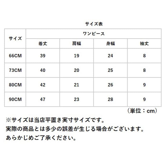 | サイズ | 【ワンピース】 ・66CM ・73CM ・80CM ・90CM 【ヘアバンド】 [縦]約3cm/[横]約20cm ※ヘアバンドは全サイズ共通になります。 ※サイズについて詳細は、商品画像の中にあるサイズ表をご覧くださいませ。 |