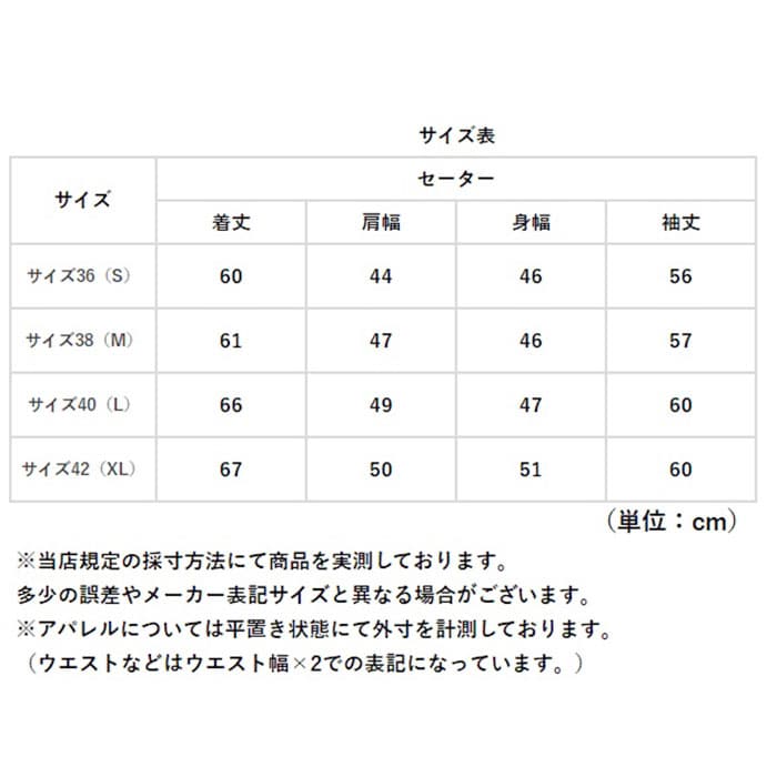 | サイズ | [メンズ] ・サイズ36(S) ・サイズ38(M) ・サイズ40(L) ・サイズ42(XL) ※サイズについて詳細は、商品画像の中にあるサイズ表をご覧くださいませ。 |