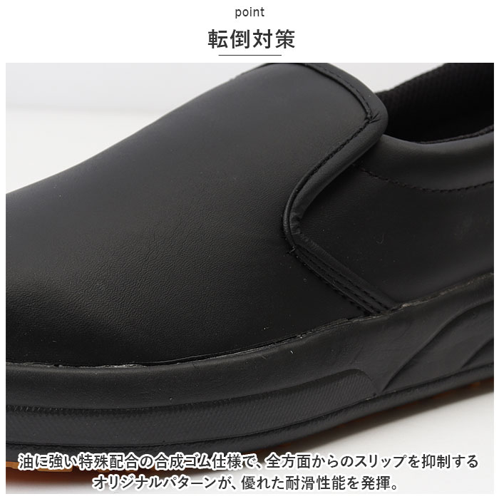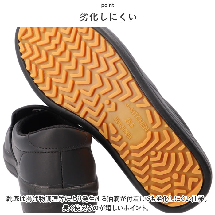 | 商品説明 | 優れた耐油・耐滑性能で厨房の作業に最適!転倒対策を目的として開発された「J-キッチン 厨房シューズ」が登場!【厨房用シューズ】優れた耐油・耐滑性能を発揮する、厨房用シューズ。食品工場や飲食店の転倒対策として開発された靴なので、機能性バツグン!【転倒対策】油に強い特殊配合の合成ゴム仕様で、全方面からのスリップを抑制するオリジナルパターンが、優れた耐滑性能を発揮。転倒対策に◎【劣化しにくい】靴底は揚げ物調理等により発生する油滴が付着しても劣化しにくい仕様。長く使えるのが嬉しいポイント。【靴紐レス】スリッポンタイプで着脱がラクラク。紐レスで結び直す必要がなく作業もはかどる。【外せるインソール】インソール部分は取り外し可能。洗濯しやすく清潔に保てるのも嬉しいポイント。【シンプルデザイン】飽きの来ないシンプルなデザイン。シーンも選ばずに使えるので、作業時はもちろん普段使いもOK! |