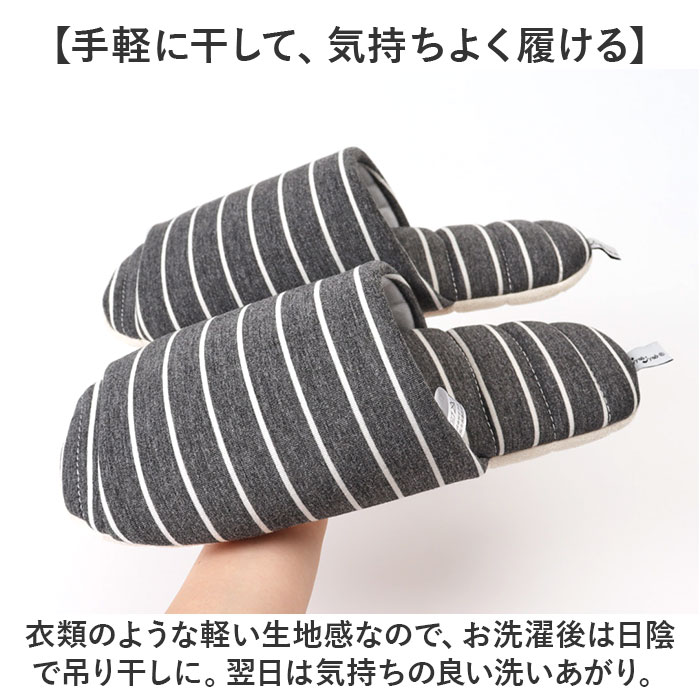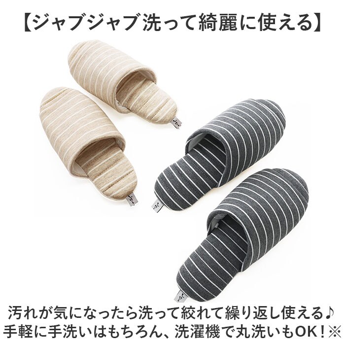 | 商品説明 | 【スリッパなのにふっくら柔らか!】洗って絞れていつも清潔!大人気「JyabJyabシリーズ」に「前開きボーダースリッパ」が仲間入り!【ふっくら快適、柔らかな履き心地】中綿をたっぷり充填したふっくら仕上げ。足にふんわり優しくスリッパと靴下の間のような履き心地。【素足のままでもサラリと快適】表生地はレーヨン素材ならではの清涼感のある生地感で、素足のままでもサラッと心地よい肌触り。【ジャブジャブ洗って綺麗に使える】汚れが気になったら洗って絞れて繰り返し使える♪手軽に手洗いはもちろん、洗濯機で丸洗いもOK!※スリッパを洗濯ネットを入れ、標準コースでお洗濯してください。【洗った後、絞れるのって本当?】JyabJyabは絞れちゃう!硬い芯のない中敷きと、底のステッチの働きで絞っても形が崩れない♪【手軽に干して、気持ちよく履ける】衣類のような軽い生地感なので、お洗濯後は日陰で吊り干しに。翌日は気持ちの良い洗いあがり。【開放感抜群オープントゥスタイル】オールシーズン快適に履ける開放感が魅力!従来のJyabJyabシリーズにはなかった前開きタイプ。【パタパタ音がしにくい底面加工】底面はフローリングやリノリウムの床でも滑りにくく、静音効果のあるポリエステルスエード素材。【折りたたんでコンパクトに収納】中敷きに芯がないので、かかと部分をたたんで履き口に折り込めばコンパクトに収納可能。【ご家族みんなで履けるサイズ感】カップルやファミリーでゆったり履けるMサイズ&Lサイズの2サイズ展開。リンクコーデがオススメ!※Mサイズ(22.5cm~25.0cm)、Lサイズ(25.5cm~27.5cm)。カラーにより、お取り扱いサイズが異なります。 |