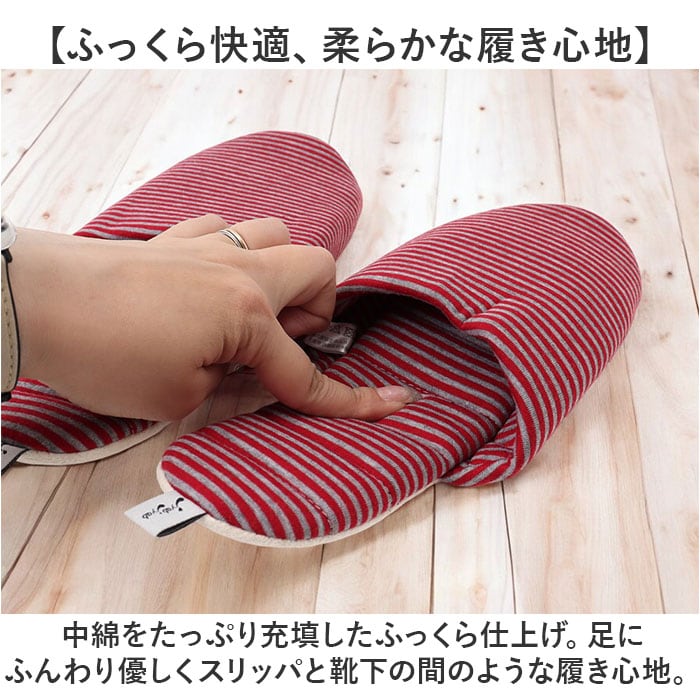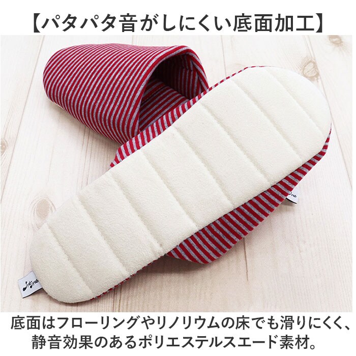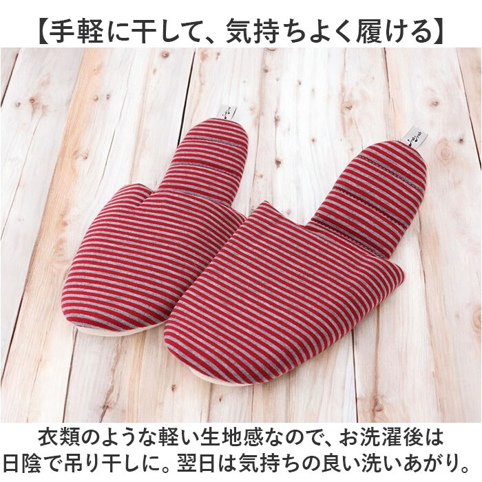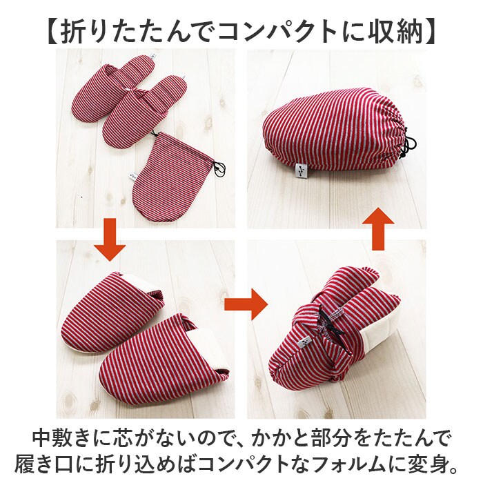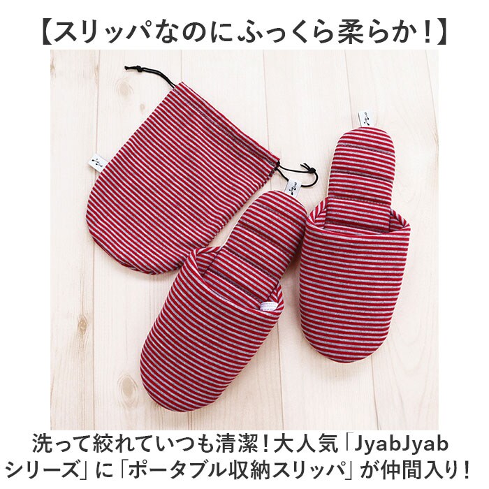 | 商品説明 | 【スリッパなのにふっくら柔らか!】洗って絞れていつも清潔!大人気「JyabJyabシリーズ」に「ポータブル収納スリッパ」が仲間入り!【ジャブジャブ洗って綺麗に使える】汚れが気になったら洗って絞れて繰り返し使える♪手軽に手洗いはもちろん、洗濯機で丸洗いもOK!※スリッパを洗濯ネットを入れ、標準コースでお洗濯してください。【洗った後、絞れるのって本当?】JyabJyabは絞れちゃう!硬い芯のない中敷きと、底のステッチの働きで絞っても形が崩れない♪【手軽に干して、気持ちよく履ける】衣類のような軽い生地感なので、お洗濯後は日陰で吊り干しに。翌日は気持ちの良い洗いあがり。【ふっくら快適、柔らかな履き心地】中綿をたっぷり充填したふっくら仕上げ。足にふんわり優しくスリッパと靴下の間のような履き心地。【パタパタ音がしにくい底面加工】底面はフローリングやリノリウムの床でも滑りにくく、静音効果のあるポリエステルスエード素材。【折りたたんでコンパクトに収納】中敷きに芯がないので、かかと部分をたたんで履き口に折り込めばコンパクトなフォルムに変身。【持ち運びに便利なポーチ付き】スリッパと同じカジュアルなボーダー柄がオシャレ!巾着タイプのポーチに入れて楽らく持ち運び。【さまざまなシーンで便利に使える】入学式や授業参観などの学校行事はもちろん、長時間乗り物で移動する時や災害時などにも大活躍。 |