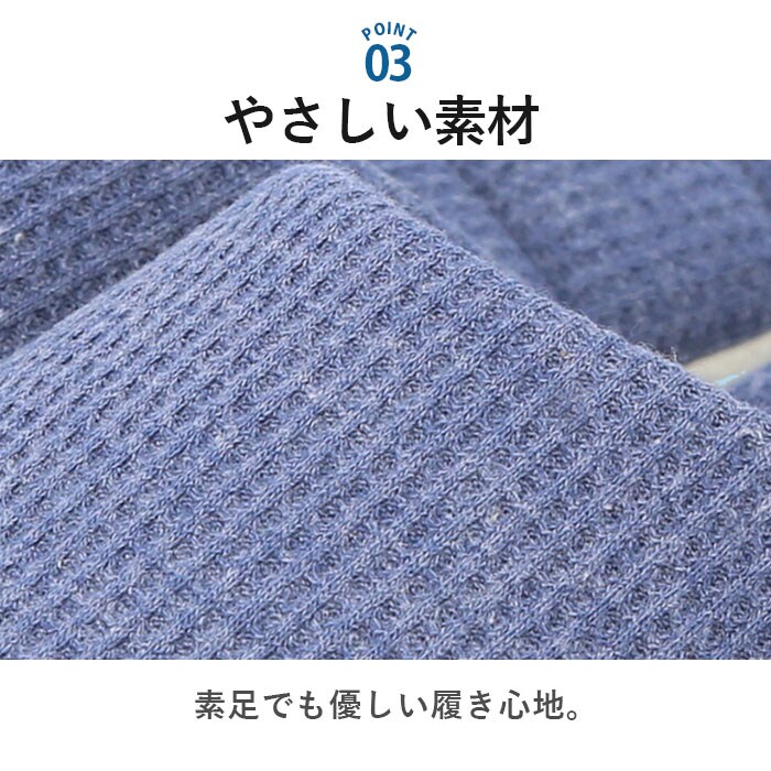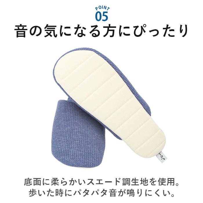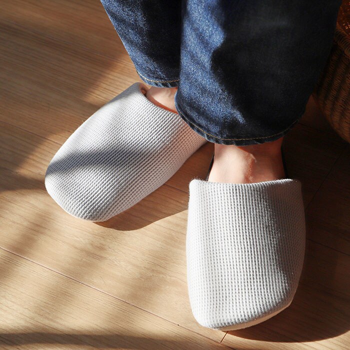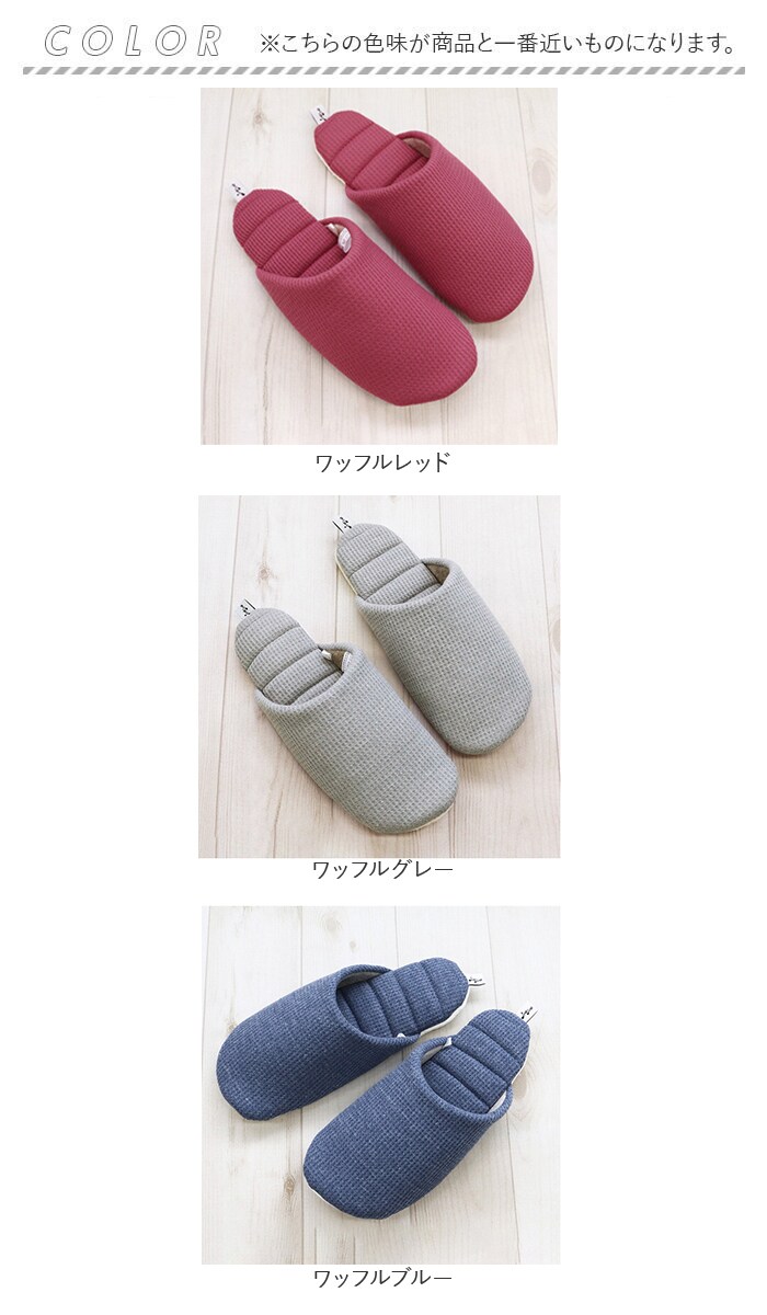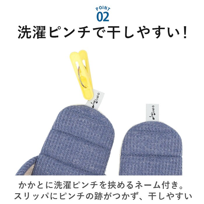 | 商品説明 | 洗って絞れる「ジャブジャブシリーズ」から、ワッフルタイプのスリッパが登場。洗濯機でも手洗いでもジャブジャブ洗える!お洗濯後はスリッパをギュッと絞り、吊り下げて乾かせるお手入れがラクチンなスリッパ!(※水温40度以下。洗濯機で洗う場合は、洗濯ネットを使用してください。)かかとに洗濯ピンチを挟めるネーム付き。スリッパにピンチの跡がつかず、干しやすいのがポイント。表面は編み物と織り物を組み合わせたような、ワッフル素材を採用!ざっくりとした風合いで、素足でも優しい履き心地。中敷きに芯のような硬い素材を使っていないので、スリッパ全体が折り曲がるくらいの柔らかさ♪スリッパと靴下の間のような感覚で履けちゃう!中敷きと底のステッチは、絞ってもよれにくく形が戻る仕組み◎底面に柔らかいスエード調生地(ポリエステル)を使用。歩いた時にパタパタ音が鳴りにくく、音の気になる方にぴったり。ご家族お揃いで使える2サイズ展開! |
