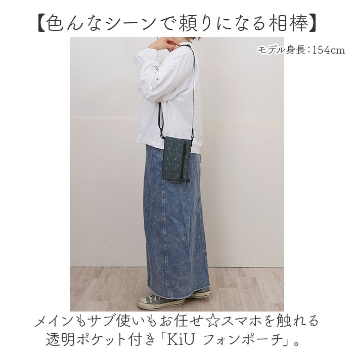 | 商品説明 | 【色んなシーンで頼りになる相棒】メインもサブ使いもお任せ☆スマホを触れる透明ポケット付き「KiU フォンポーチ」。【ポケットに入れたままスマホ操作】クリアポケットにスマホをINしたまま操作可能◎移動中のひと手間を軽減できストレスフリー!(※1)ご使用の保護フィルムの厚みによっては、操作できない場合があります。【開閉スムーズ、安心のファスナー式】メインルームはガバっと開いて取り出しやすく、ファスナーを閉じれば中身の飛び出しをガード。【必要最低限をひとまとめ】小銭入れやエチケットアイテムを収納。王とドアやレジャー、フェスなどでも重宝◎【サクッと取り出せて迷子知らず】フロントにもポケットを配置。細々した物も、すっきり整理整頓。【両手が空いて移動がラクラク】長さ調節可能なストラップを取り付けて、斜め掛け。アクティブシーンも快適。【お好みで選べる縦横両用タイプ】ストラップを付け替えると、縦にも横にも使える2way!気分やコーデに応じて使い分け☆【バッグイン可能で使い方自在】ストラップを取り外せば、ポーチとしても活用。バッグに忍ばせて旅先などでスタイルチェンジ!【軽やかな使い心地でノンストレス】スリムサイズ&体に負担をかけない軽量設計。疲れを軽減できるのが嬉しいポイント。【ちょっとの雨なら大丈夫】表面にはっ水加工、裏面に防水加工を。汚れや水滴を弾きやすく、お手入れも拭き取るだけ。(※2)完全防水ではありません。【お揃いOK☆ユニセックスデザイン】シンプルな無地タイプや、個性が光るデザインをラインナップ!お揃いやシェアも。【KiU-キウ】・「どんな天気でもその場を楽しむ」をモットーに、大人の外遊びを応援するブランド。【ポケット仕様】前面:ファスナーポケット×1背面:ファスナー式クリアポケット×1 |