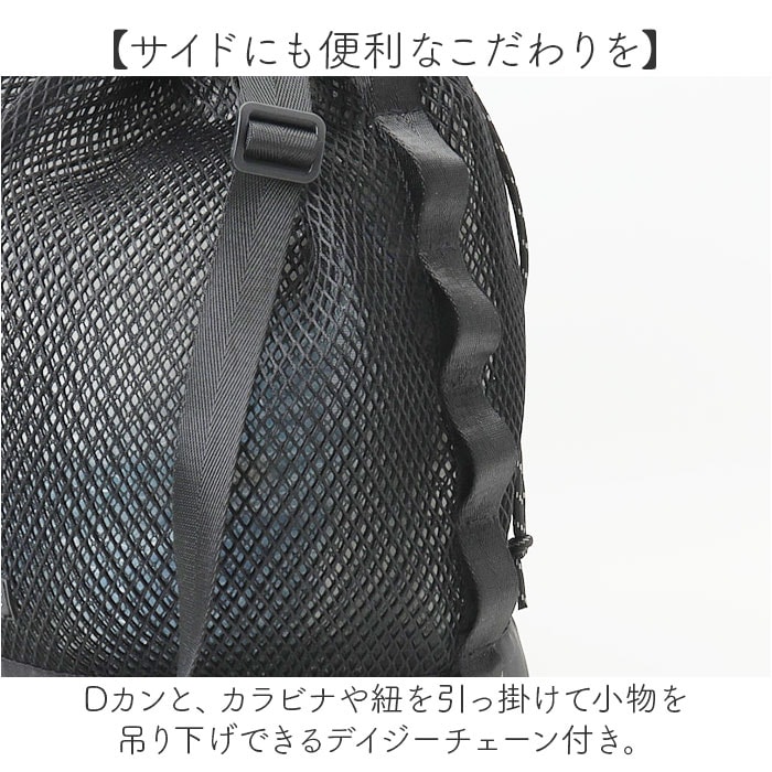 | 商品説明 | 【夏のお出かけやレジャーにぴったり】爽やかな印象で、暑い季節のコーデにもマッチ!「KiU ダブルメッシュドローストリングショルダー」。【スタイリッシュで機能面も安心】涼しげなメッシュ&バイカラー☆通気性のある生地感ながら、目隠し効果もあり使い勝手抜群。【お好みに合わせてスタイルチェンジ】トートバッグとして♪長さ調節可能なショルダーを取付、斜め掛けもできる2way!【キュッと絞れる巾着タイプ】開口部の紐を絞って開閉がスムーズ。中身の飛び出しもガード。【必要な荷物をざっくりひとまとめ】程よいマチと高さを設け、見た目以上に入る容量約15L。ドリンクボトルもすっぽり。(※)耐荷重は約10kgです。【サクッと取り出せて迷子知らず】内側にポケットを1つ配置。細々した物も、バッグの中で探す手間が不要。【サイドにも便利なこだわりを】Dカンと、カラビナや紐を引っ掛けて小物を吊り下げできるデイジーチェーン付き。【お揃いOK☆ユニセックスデザイン】シンプルなカジュアルデザインに、フロントにはラバータグをON。お揃いやシェアも!【KiU-キウ】・「どんな天気でもその場を楽しむ」をモットーに、大人の外遊びを応援するブランド。【ポケット仕様】内側:オープンポケット×1 |