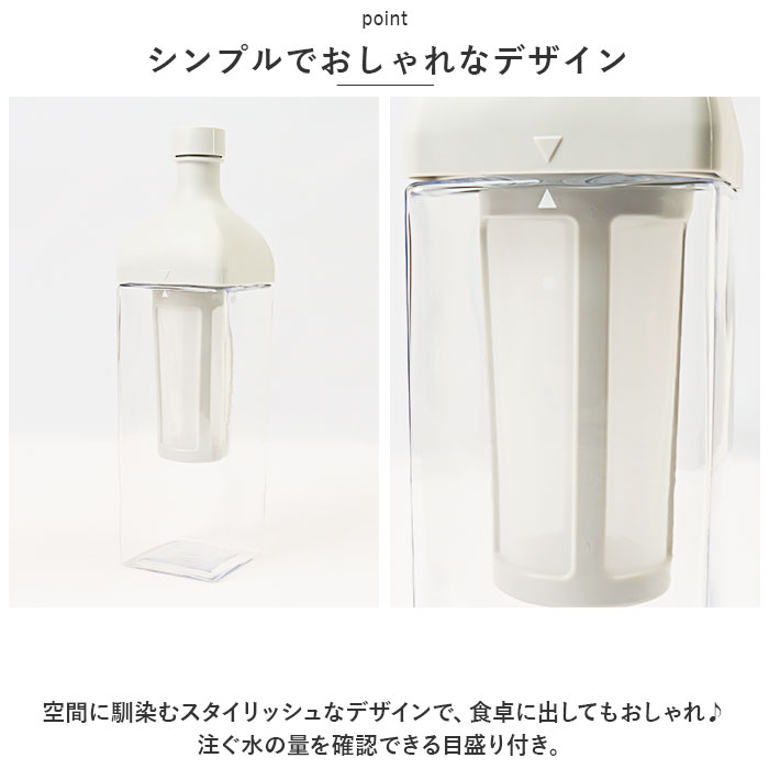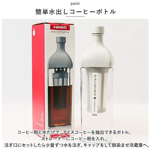 | 商品説明 | 自宅で手軽にアイスコーヒーを楽しめる♪「HARIO カークコーヒーボトル」が新登場。【簡単水出しコーヒーボトル】コーヒー粉と水だけで、アイスコーヒーを抽出できるボトル。ストレーナーにコーヒー粉を入れ、注ぎ口にセットしたら少量ずつ水を注ぎ、キャップをして馴染ませ冷蔵庫へ。【甘味のあるコーヒーが完成】冷蔵庫で8時間抽出すると、雑味のないまろやかなコーヒーの出来上がり◎ストレーナーが付いているから、作ってそのまま注げちゃう!【使い勝手の良い角型タイプ】容量1500ml、出来上がりの容量は1000ml。冷蔵庫のドアポケットにすっぽり収まり、横置き保存もできて便利!【軽くて丈夫な安心素材】本体は透明性・耐熱性・衝撃強度のあるPCT樹脂製。軽量で丈夫な、安心の日本製。【お手入れラクラク】パーツを分解して洗えて、食洗機にも対応。忙しい毎日の味方!【シンプルでおしゃれなデザイン】空間に馴染むスタイリッシュなデザインで、食卓に出してもおしゃれ♪注ぐ水の量を確認できる目盛り付き。 |