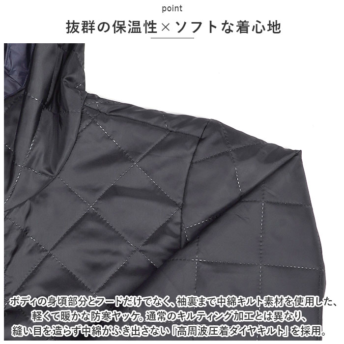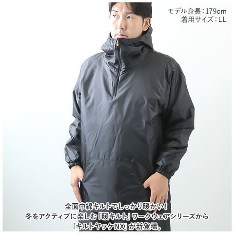 | 商品説明 | 全面中綿キルトでしっかり暖かい!冬をアクティブに楽しむ「暖キルト」ワークウェアシリーズから「キルトヤッケNX」が新登場。【抜群の保温性×ソフトな着心地】ボディの身頃部分とフードだけでなく、袖裏まで中綿キルト素材を使用した、軽くて暖かな防寒ヤッケ。通常のキルティング加工とは異なり、縫い目を造らず中綿がふき出さない「高周波圧着ダイヤキルト」を採用。【ふんわり、ぽかぽかの暖かさ】キルティング生地内側には、ポリエステル綿100%素材をふんわり充填。冷たい木枯らしが吹く日でも、ヤッケの中はぽかぽかの暖かさ。【動きやすさはそのままキープ】袖の裏までキルト素材で仕上げた、総裏キルティング仕様。暖かく着心地もやわらかなので、袖がモコモコせず動きやすいのが嬉しいポイント。【大開口ファスナーで着脱楽ちん】フードの前立てから胸元まで大きく開く「大開口ファスナー」で、着脱がラクラクできるプルオーバータイプ。【調節できるハイネック+フード】首元の襟部分はハイネックタイプ。ファスナージップをしっかり上げれば冷たい風を防いで保温性が向上。フードのフチも首元のドローコードで調節可能。【身体にピタッとフィット】袖口ゴムと裾の調節コードで、ヤッケが身体にぴったりフィット!手元の動きが邪魔されず、隙き間風も防いでしっかり保温。【便利なカンガルーポケット】ヤッケの前面には、スマホやキーケースなど、普段使いの小物が左右から出し入れしやすいカンガルーポケット付き。【カジュアルスタイルと相性抜群】カジュアルスタイルにあわせやすいデザインと、ネイビー・オリーブ・ブラックのスタンダードなカラー展開。屋外での作業やウォーキング等のフィットネスまで幅広く大活躍。 |