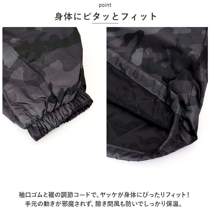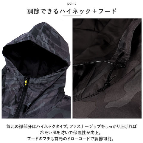 | 商品説明 | 全面中綿キルトでしっかり暖かい!冬をアクティブに楽しむ「暖キルト」ワークウェアシリーズから「プリント柄・キルトヤッケNX」が新登場。【抜群の保温性×ソフトな着心地】ボディの身頃部分とフードだけでなく、袖裏まで中綿キルト素材を使用した、軽くて暖かかな防寒ヤッケ。通常のキルティング加工とは異なり、縫い目を造らず中綿がふき出さない「高周波圧着ダイヤキルト」を採用。【ふんわり、ぽかぽかの暖かさ】キルティング生地内側には、ポリエステル綿100%素材をふんわり充填。冷たい木枯らしが吹く日でも、ヤッケの中はぽかぽかの暖かさ。【動きやすさはそのままキープ】袖の裏までキルト素材で仕上げた、総裏キルティング仕様。暖かく着心地もやわらかなので、袖がモコモコせず動きやすいのが嬉しいポイント。【大開口ファスナーで着脱楽ちん】フードの前立てから胸元まで大きく開く「大開口ファスナー」で、着脱がラクラクできるプルオーバータイプ。【調節できるハイネック+フード】首元の襟部分はハイネックタイプ。ファスナージップをしっかり上げれば冷たい風を防いで保温性が向上。フードのフチも首元のドローコードで調節可能。【身体にピタッとフィット】袖口ゴムと裾の調節コードで、ヤッケが身体にぴったりフィット!手元の動きが邪魔されず、隙き間風も防いでしっかり保温。【便利なカンガルーポケット】ヤッケの前面には、スマホやキーケースなど、普段使いの小物が左右から出し入れしやすいカンガルーポケット付き。【カジュアルスタイルと相性抜群】シンプルなシルエットと、ネイビー・オリーブ・ブラック、ワイルドなカモフラージュ柄でスタイリッシュに着こなせる!屋外での作業やウォーキング等のフィットネスまで幅広く大活躍。 |