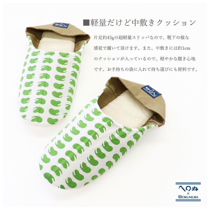 | 商品説明 | 温故知新な暮らしかた♪使うほどに、洗うほどに愛着のわく、手拭いスリッパが新登場。創業明治24年の「オクムラ」と、古き良き物を新しい感覚で取り入れる「かまわぬ」のコラボアイテム♪気持ちが明るくなる楽しい絵柄のてぬぐいと、綿生地を組み合わせて作られたスリッパ。昔ながらの「注染」と呼ばれる技法で染めた、本染てぬぐいを使用。使うほどに風合いが増し、肌なじみも優しく変化!片足約43gの超軽量タイプ!靴下のような感覚で履けるのが嬉しいポイント◎中敷きには暑さ約1cmのクッション入りで、軽やかな履き心地。お手持ちの収納袋に入れて、持ち運びもラクラク。かかとを踏んでパブーシュタイプ、かかとを起こしてルームシューズタイプと、お好みに合わせて履き方を選べる2way仕様!底面は歩いた時にパタパタ音が鳴りにくい、綿100%素材。かかと部分には滑り止め付きで安心。汚れが気になったらご自宅で丸ごと洗えるから、いつも清潔◎安心の日本製。ちょっとしたギフトにもおすすめ。 |