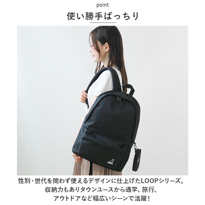 | 商品説明 | イギリス発祥の帽子ブランド「KANGOL」のLOOPシリーズから、たっぷり入るリュック(ポーチ付き)が新登場。【使い勝手ばっちり】性別・世代を問わず使えるデザインに仕上げたLOOPシリーズ。収納力もありタウンユースから通学、旅行、アウトドアなど幅広いシーンで活躍!【ガバっと開くファスナー開口】メインルーム開口部は、左右どちらからもラウンド型にオープン。大きく開いて中身を確認しやすく。取り出しもスムーズ。【B4サイズ対応】内側はA4サイズがすっぽり、B4サイズも収まる大きさ。お出かけに必要な荷物をざっくりと収納しつつ、満員電車などの人混みでも邪魔になりにくいマチ設計。(※B4サイズは物によって角が折れやすい可能性もありますのでご注意ください。)【上手に整理整頓】ノートPCを収納できるクッションポケットや、サッと取り出しやすいポケット、貴重品を安心して持ち運べるシークレットポケットなど合計4つのポケットを装備。【背負い心地快適】背面とショルダーベルトは程よいクッション性があり、体にかかる負担を軽減。背面はムレにくいメッシュ素材。【うれしいポーチ付き】カード類や細々した物を入れられる、ファスナーポーチが付属。サイドのDカンに取り付けても良し、バッグインしたり単体使いもOK。【シンプルなデザイン】カジュアルコーデに馴染みやすく、どなたでも使いやすい無地カラー仕上げ。フロントポケットにプラスした刺しゅうロゴがアクセント。【ポケット仕様】内側:面ファスナー式クッションポケット×1、ファスナーポケット×1前面:ファスナーポケット×1背面:シークレットポケット×1 |