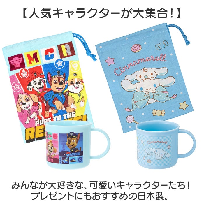 | 商品説明 | 【コップの持ち運びがラクラク】給食・歯磨き用のコップを収納!キャラクターデザインの「コップ袋&プラコップセット」。【人気キャラクターが大集合!】みんなが大好きな、可愛いキャラクターたち!プレゼントにもおすすめの日本製。《コップ袋》【キュッと絞って飛び出しをガード】ヒモで口を絞れる巾着タイプ。お子さまも扱いやすく、中身がこぼれ落ちない♪【通気性に優れたコットン製】使用後のコップを入れてもムレにくい◎衛生的に使えるアイテム。(※1)水気をよく拭き取ってから収納してください。【コップがすっぽり収まるサイズ感】程よい縦型フォルム。コップが飛び出さず、全体がしっかり収まるのが嬉しい!《プラコップ》【小さな手にも優しくフィット】取っ手が付いて手に持ちやすく、お子さまが飲みやすい程よい容量200mlサイズ。【幼稚園や保育園での使用に最適】落としても割れにくい、丈夫なポリプロピレン素材。小さなお子さま1人での使用も安全。【電子レンジで温められる耐熱性】耐熱温度は140度。電子レンジでの温め直しもできて便利。【お手入れしやすくいつも清潔キープ】嬉しい食洗機対応!抗菌加工を施し、銀イオンの力で細菌の繁殖を抑制。(※2)全ての細菌の増殖を抑制するものではありません【お友だちとお揃いでも大丈夫】お名前シールが付属。きちんと名前を書いておけて、保育園や学校での使用に最適。 |