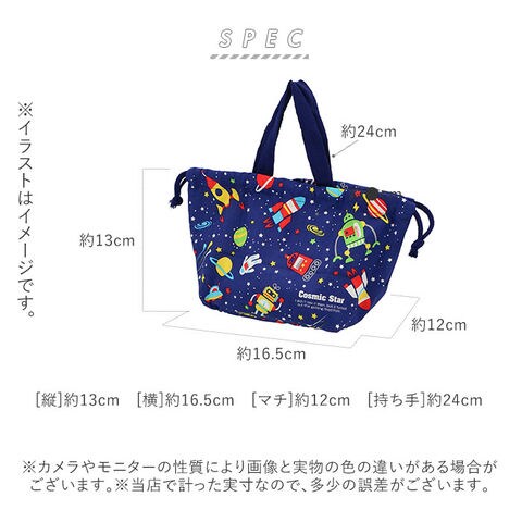 | 注意点 | ランチボックス用の巾着袋です。本来の用途以外のご使用はお避けください。漂白剤は使用しないでください。色物は初め、若干色落ちをすることがありますので、白い物と一緒に洗わないでください。カメラやモニターの性質により、画像と実物の色の違いがある場合がございますのでご理解願います。 |