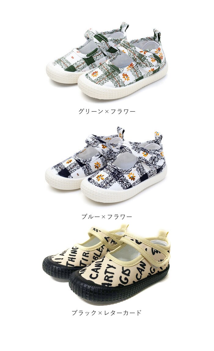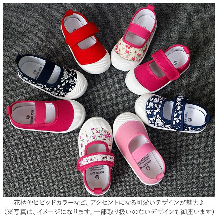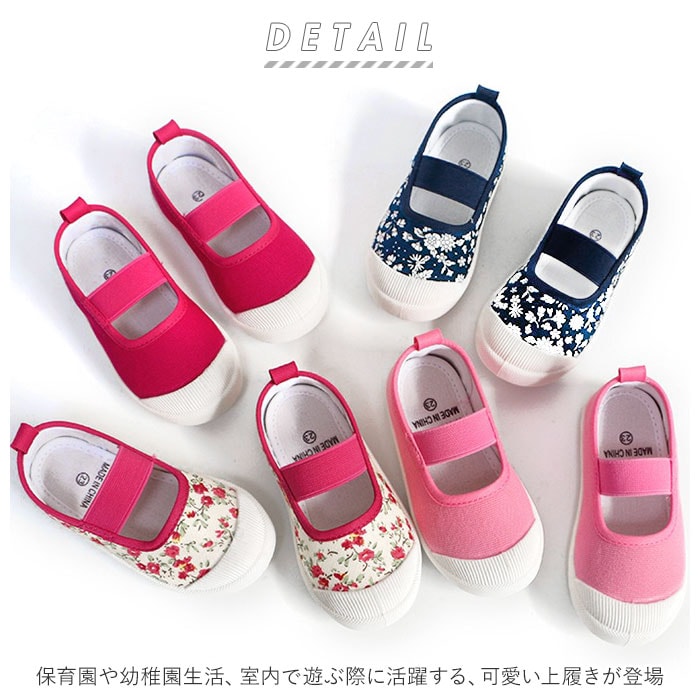 | 商品説明 | 保育園や幼稚園生活、室内で遊ぶ際に活躍する、可愛い上履きが登場。一般的な上履きと同じ、ゴムバンド付きのデザイン。足にぴったりフィットして脱げにくい◎ソールと一体成型されたトゥガードが、足指を保護。花柄やビビッドカラーなど、アクセントになる可愛いデザインが魅力♪ |