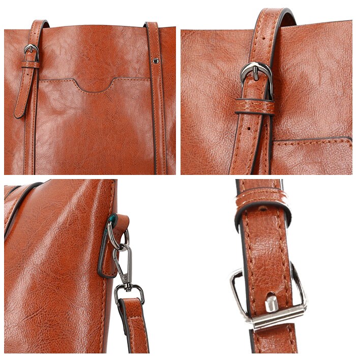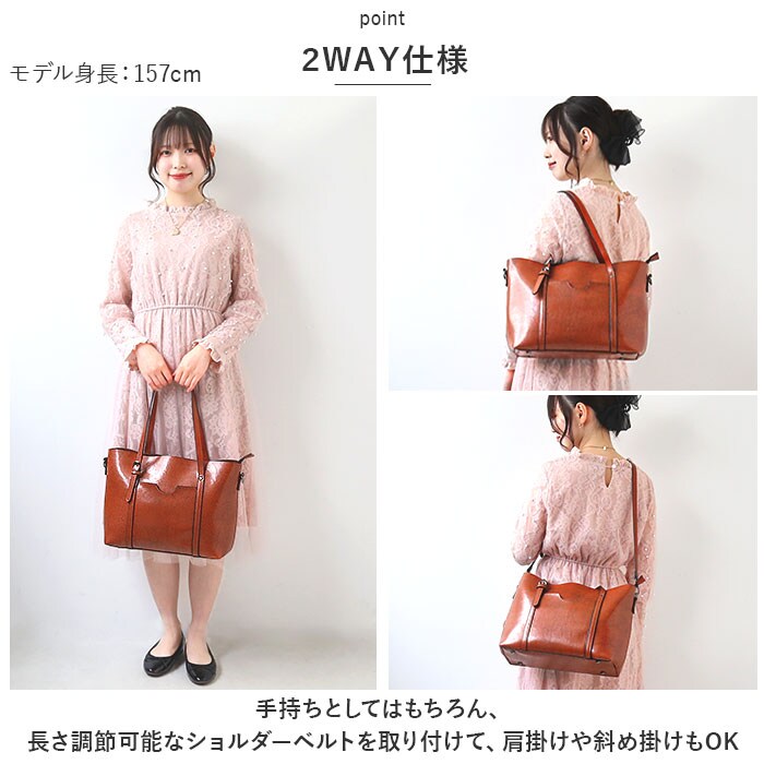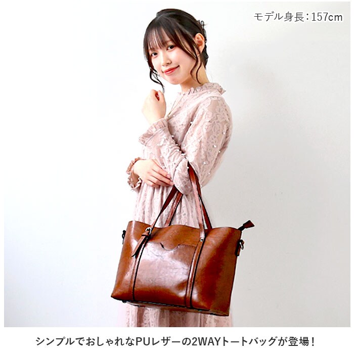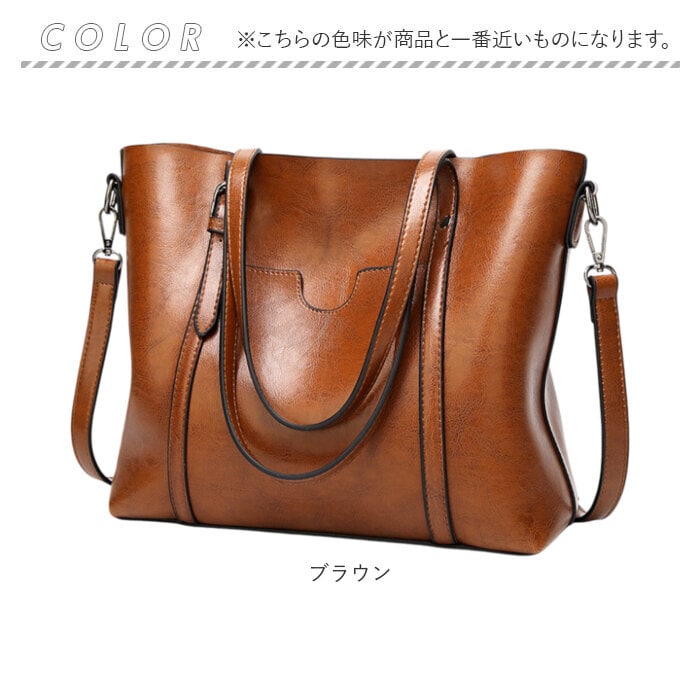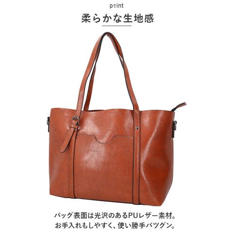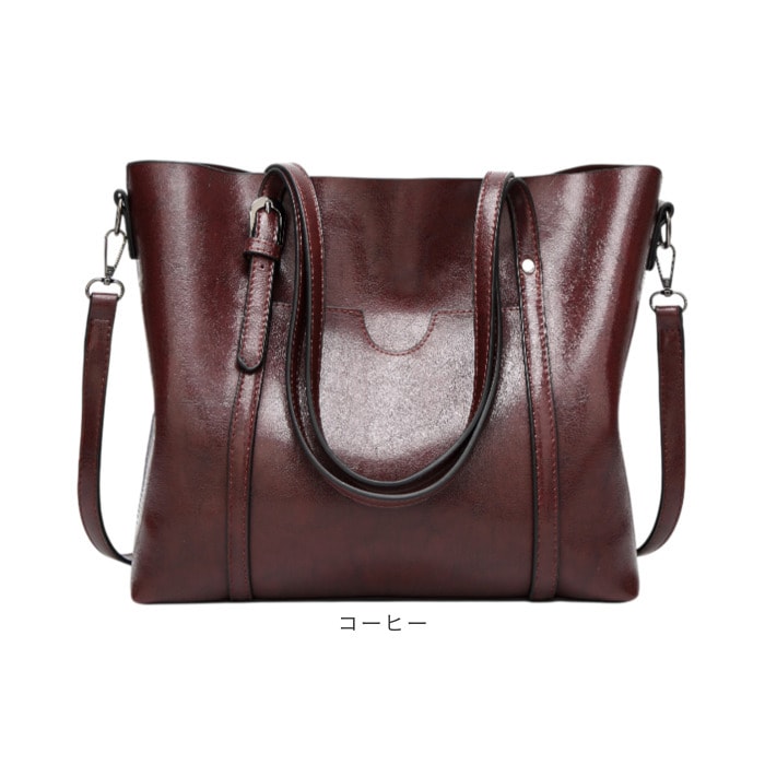 | 商品説明 | シンプルでおしゃれなPUレザーの2WAYトートバッグが登場!【2WAY仕様】手持ちとしてはもちろん、長さ調節可能なショルダーベルトを取り付けて、肩掛けや斜め掛けもOK。【柔らかな生地感】バッグ表面は光沢のあるPUレザー素材。お手入れもしやすく、使い勝手バツグン。【ファスナー開閉】メイン開口部は天ファスナー式で中身が見えずプライバシーを確保!【B5サイズが入る】程よいマチがあり、500mlのペットボトルや長財布などB5サイズがすっぽり入る◎【仕切りポケット】メイン収納は仕切りにもなるファスナーつきポケット仕様!ポケットも多いので、ゴチャつきがちなカバンの中を仕分けし、整理整頓がしやすい。【底鋲付き】底鋲付きなので床に置いても鞄が自立するので、鞄の底が汚れてしまったり、擦れてしまうことを軽減!【通勤、通学に】機能性とデザイン性で、通勤・通学用にピッタリ!【ポケット仕様】メイン収納:オープンポケット×2、ファスナー付きポケット×2フロント:オープンポケット×1 |
