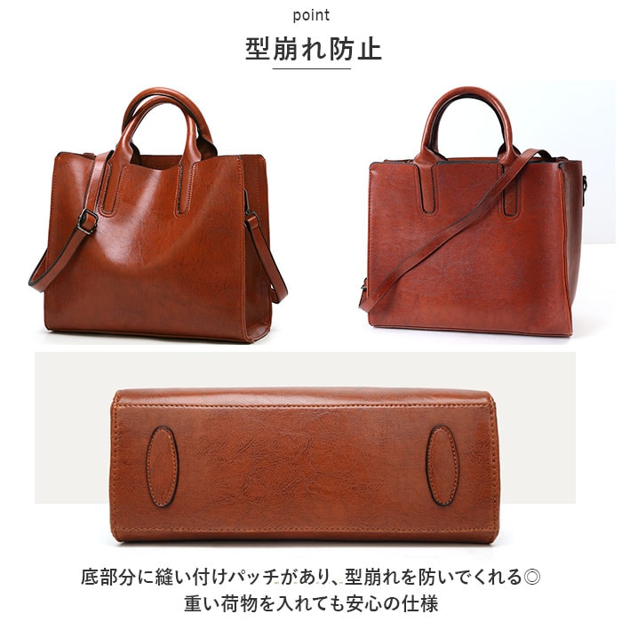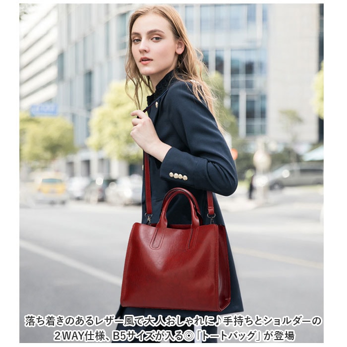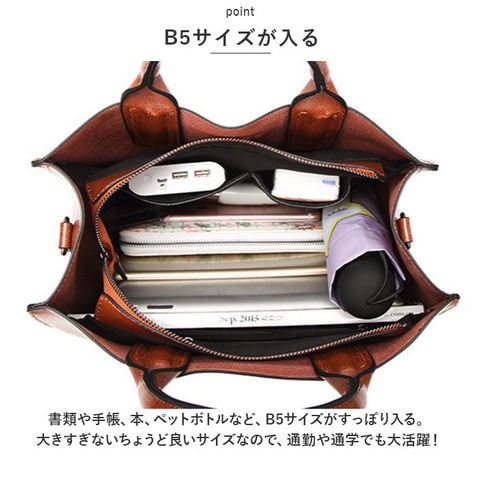 | 商品説明 | B5サイズが入る◎手持ちとショルダーの2WAY仕様、落ち着きのあるレザー風で大人おしゃれに♪「トートバッグ」が登場【B5サイズが入る】書類や手帳、本、ペットボトルなど、B5サイズがすっぽり入る。大きすぎないちょうど良いサイズなので、通勤や通学でも大活躍!【2WAY仕様】持ち手を使用し、トートとして使うのはもちろん、荷物が多く両手を開けたいときなどには、付属のストラップでショルダーバッグにも◎【長さ調節可能】ショルダーストラップはベルト穴があるので、長さ調節が可能。取り外しもOK。服装や体型に合わせて調節できる。【上品なレザー調】お手入れが簡単なPU素材を使用し、上品なレザー調に仕上げたアイテム。シンプルで無駄のないデザインですっきり高見え♪【仕切りポケット】メイン収納には仕切りにもなるファスナーつきポケットが!ゴチャつきがちなカバンの中を仕分けし、整理整頓がしやすい仕様。【型崩れ防止】底部分に縫い付けパッチがあり、型崩れを防いでくれる◎重い荷物を入れても安心の仕様。【大人カラー】ビジネスシーンやデイリー使いにも馴染む、大人カラーの展開。お好きな色がきっと見つかる。【ポケット仕様】メイン収納:オープンポケット×3、ファスナー付きポケット×2 |