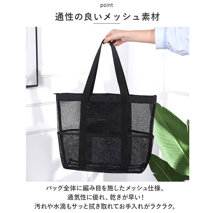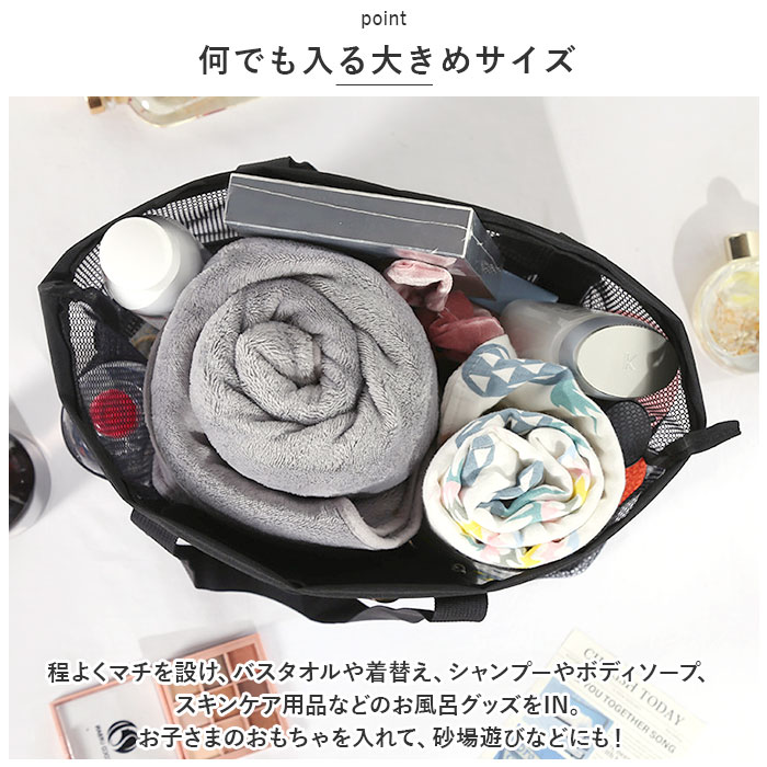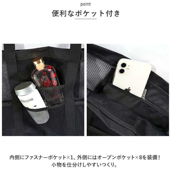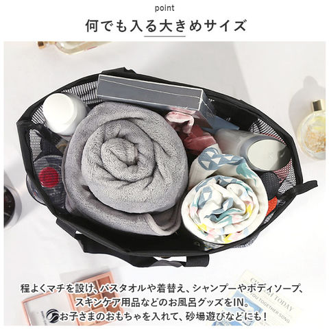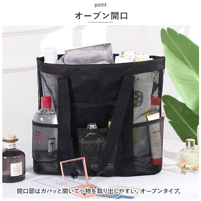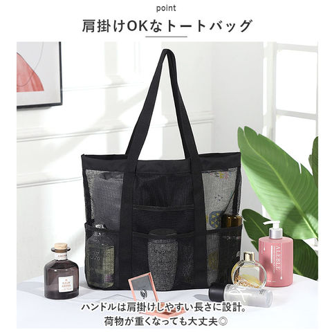 | 商品説明 | スパや温泉、ビーチなどで大活躍!濡れても安心のメッシュバッグが登場。【通性の良いメッシュ素材】バッグ全体に編み目を施したメッシュ仕様。通気性に優れ、乾きが早い!汚れや水滴もサッと拭き取れてお手入れがラクラク。【オープン開口】開口部はガバッと開いて小物を取り出しやすい、オープンタイプ。【何でも入る大きめサイズ】程よくマチを設け、バスタオルや着替え、シャンプーやボディソープ、スキンケア用品などのお風呂グッズをIN。お子さまのおもちゃを入れて、砂場遊びなどにも!【便利なポケット付き】内側にファスナーポケット×1、外側にはオープンポケット×8を装備!小物を仕分けしやすいつくり。【肩掛けOKなトートバッグ】ハンドルは肩掛けしやすい長さに設計。荷物が重くなっても大丈夫◎【シンプルなデザイン】ユニセックスデザインのブラックカラー。家族みんなで使えるのが嬉しい!【ポケット仕様】内側:ファスナーポケット×1外側前面:オープンポケット×4外側背面:オープンポケット×4 |