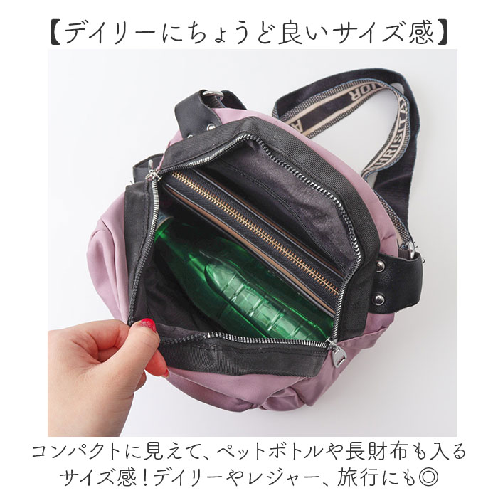 | 商品説明 | 【絶妙カラーでグッとおしゃれに☆】ころんとフォルムがたまらない!「ミニショルダーバッグ ナイロン」が登場。【デイリーにちょうど良いサイズ感】コンパクトに見えて、ペットボトルや長財布も入るサイズ感!デイリーやレジャー、旅行にも◎【ころんとフォルムが大人可愛い☆】カジュアルだけど可愛さもある、ころんとフォルムがポイント!女性らしさをプラスして♪【絶妙なくすみカラーで垢抜け!】パッと目をひく、くすみカラーのバリエーション。落ち着きのある色味だから、コーデに馴染む☆【差がつく☆ロゴストラップ】コーデのアクセントにもなる、ロゴデザインを採用したストラップ!トレンド感がグーンとUP!【小物の整理ができるポケット3つ】リップやイヤホン、鍵などの小物を仕分けできるポケットを3つ搭載。外側ポケットも便利◎【ポケット仕様】メイン収納:オープンポケット×1、ファスナーポケット×1背面:ファスナーポケット×1 |