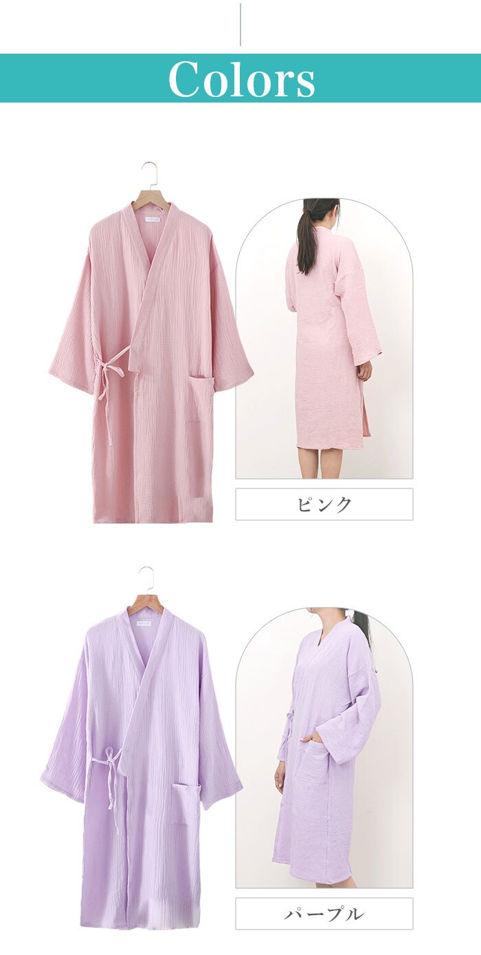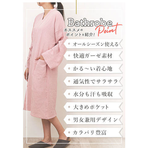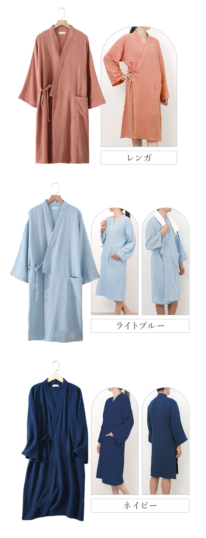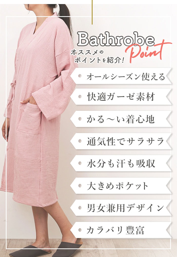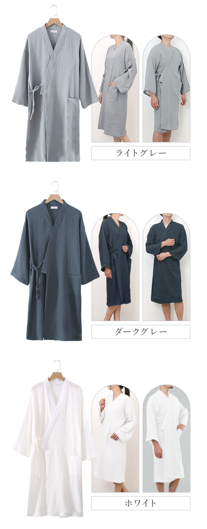 | 商品説明 | サラッと軽い着心地のバスローブ♪お風呂上がりの濡れた体に羽織ってウエスト紐を縛るだけ!吸水性と保湿力を合わせ持つ、薄手の綿素材を使用。体を優しく包み込んでくれる、肌触りの良さもポイント。左側に便利なポケット付き。おうちで洗濯できるから、お手入れがラクチン。足元まで隠れるミディアムロング丈。ナイトウェアとしても活躍!レディースとメンズ2サイズ展開♪ご夫婦やカップルで色違いで揃えるのもおすすめ。 |