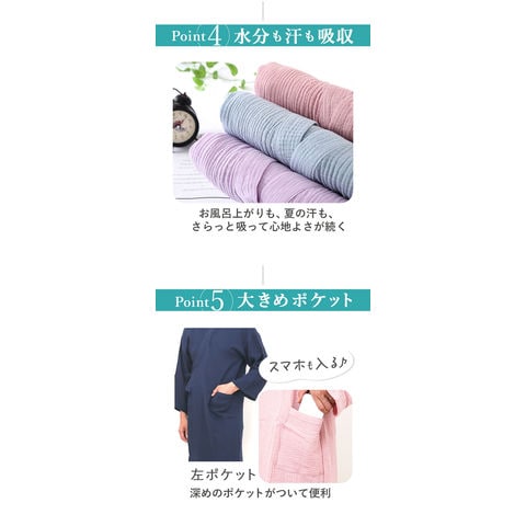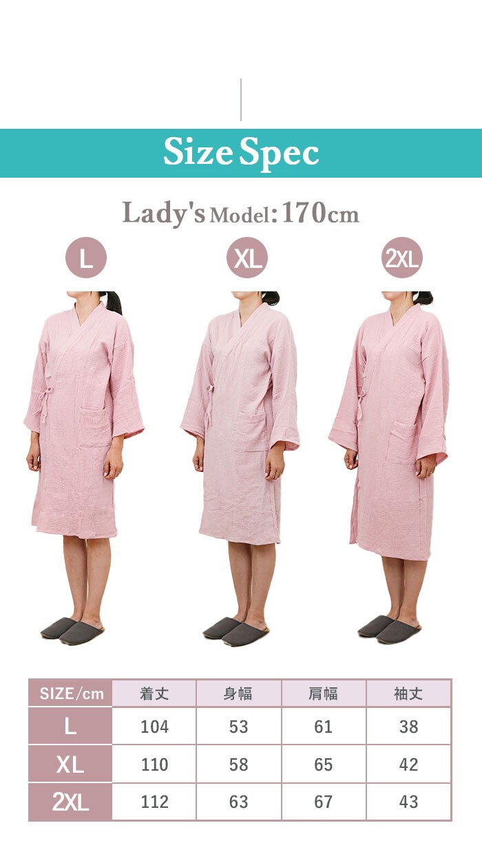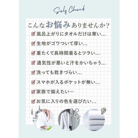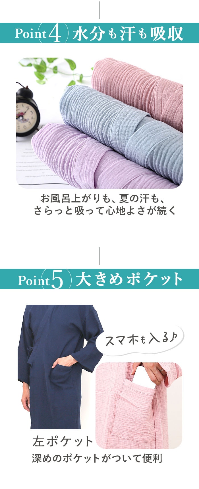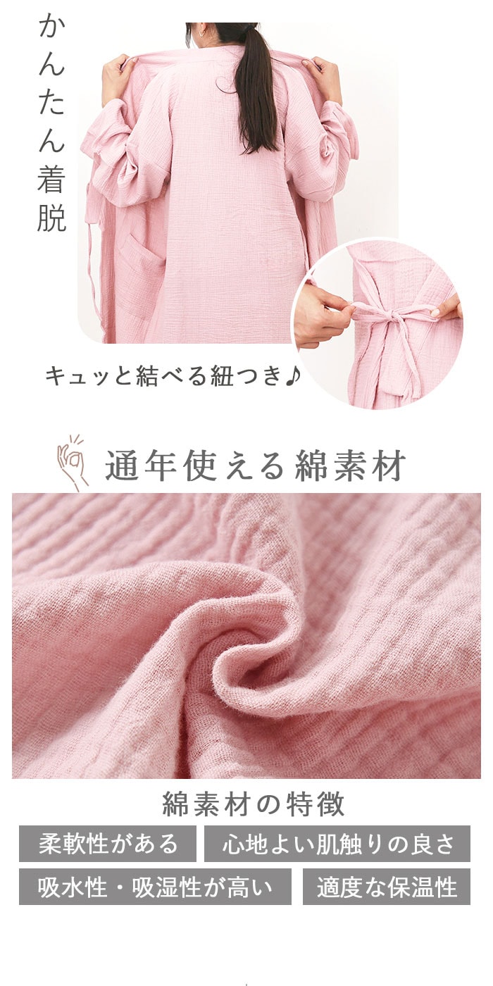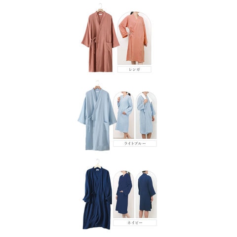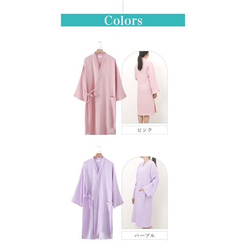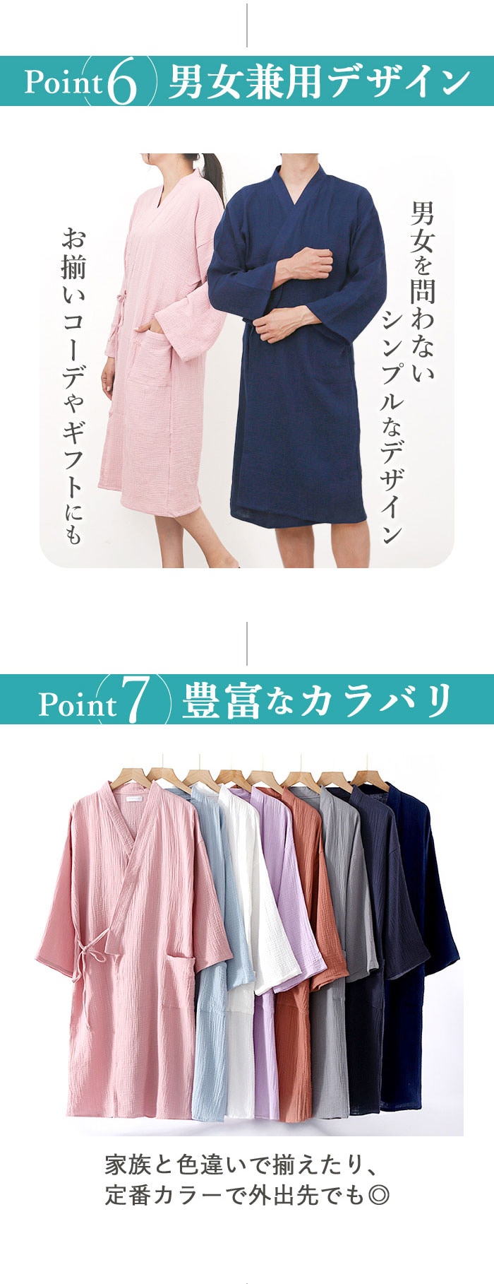 | 商品説明 | サラッと軽い着心地のバスローブ♪お風呂上がりの濡れた体に羽織ってウエスト紐を縛るだけ!吸水性と保湿力を合わせ持つ、薄手の綿素材を使用。体を優しく包み込んでくれる、肌触りの良さもポイント。左側に便利なポケット付き。おうちで洗濯できるから、お手入れがラクチン。足元まで隠れるミディアムロング丈。ナイトウェアとしても活躍!レディースとメンズ2サイズ展開♪ご夫婦やカップルで色違いで揃えるのもおすすめ。 |