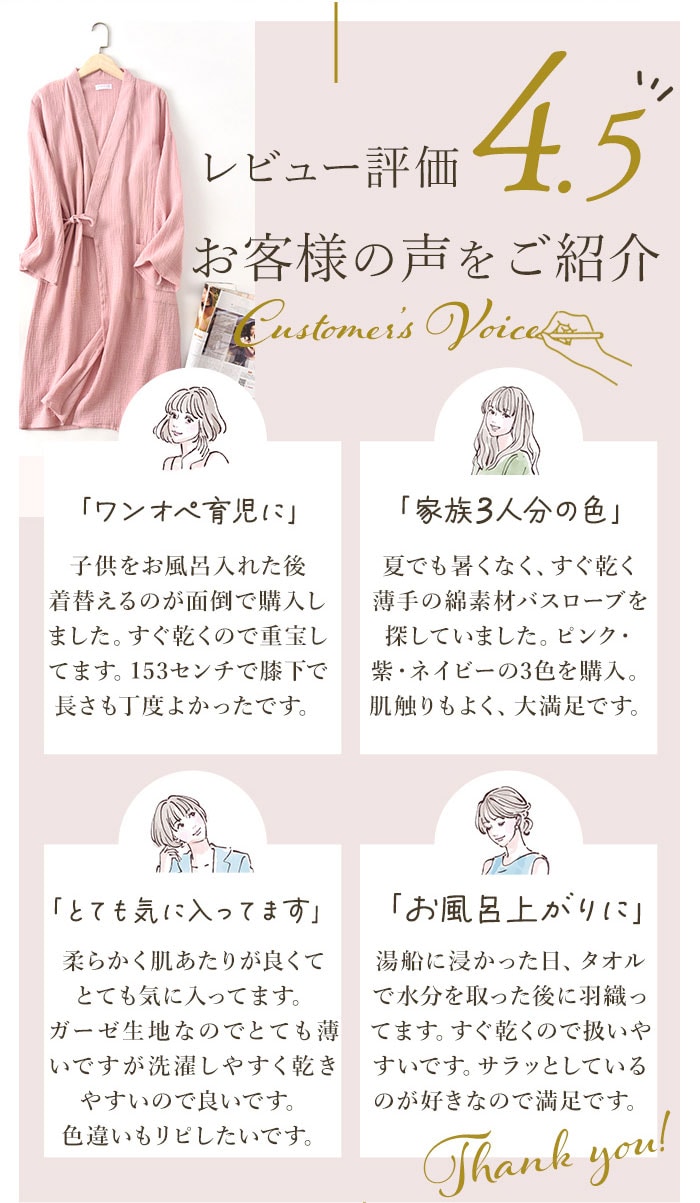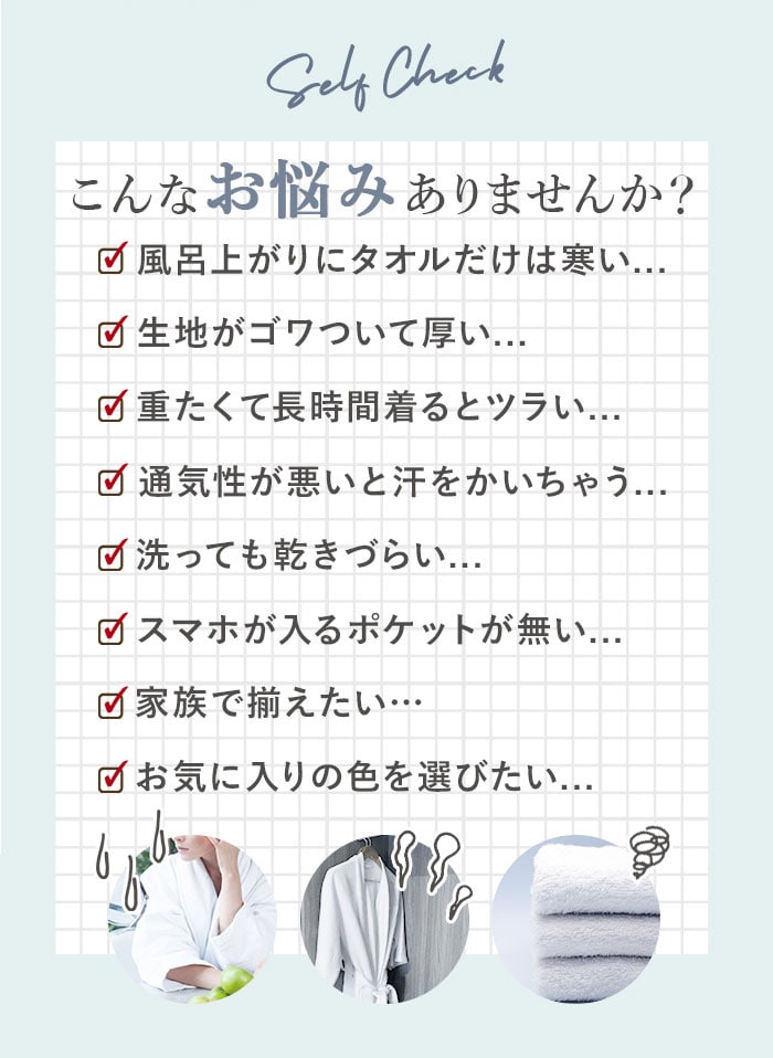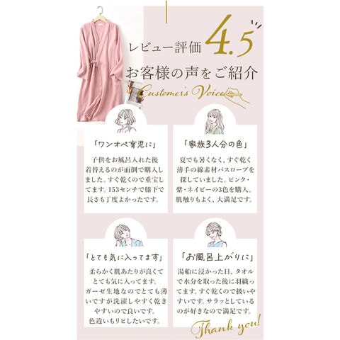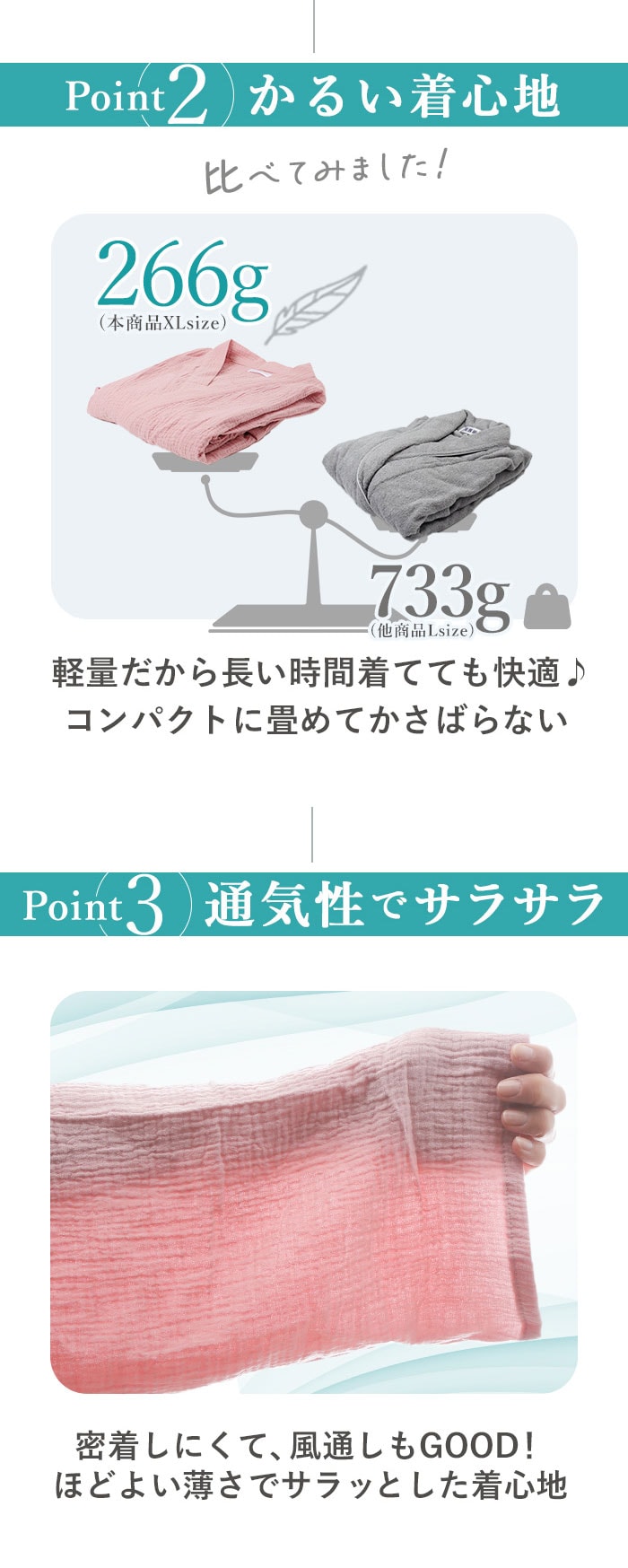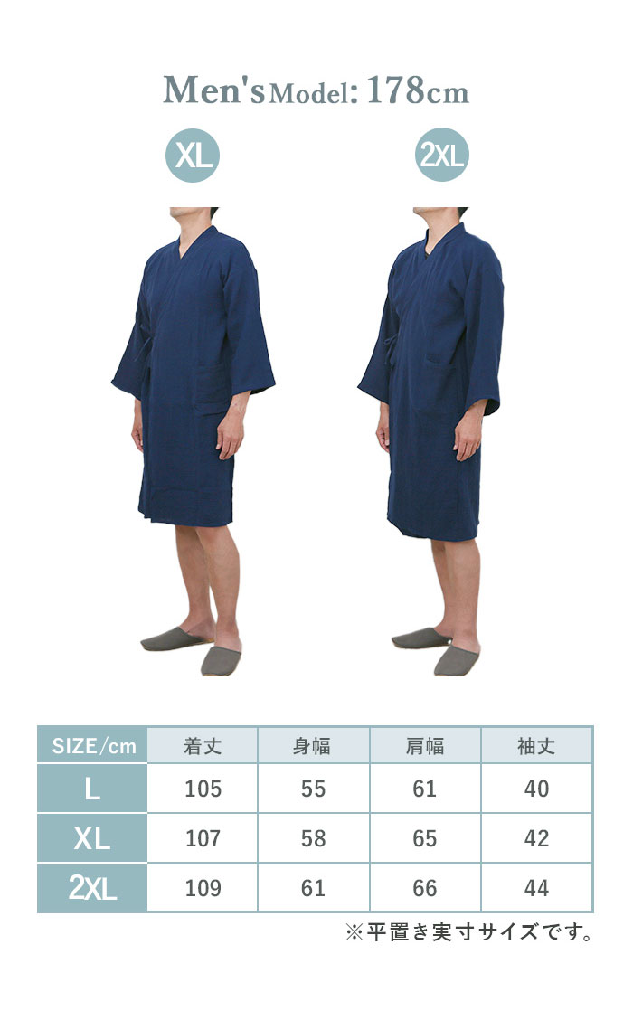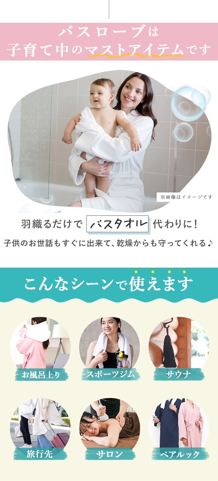 | 商品説明 | サラッと軽い着心地のバスローブ♪お風呂上がりの濡れた体に羽織ってウエスト紐を縛るだけ!吸水性と保湿力を合わせ持つ、薄手の綿素材を使用。体を優しく包み込んでくれる、肌触りの良さもポイント。左側に便利なポケット付き。おうちで洗濯できるから、お手入れがラクチン。足元まで隠れるミディアムロング丈。ナイトウェアとしても活躍!レディースとメンズ2サイズ展開♪ご夫婦やカップルで色違いで揃えるのもおすすめ。 |