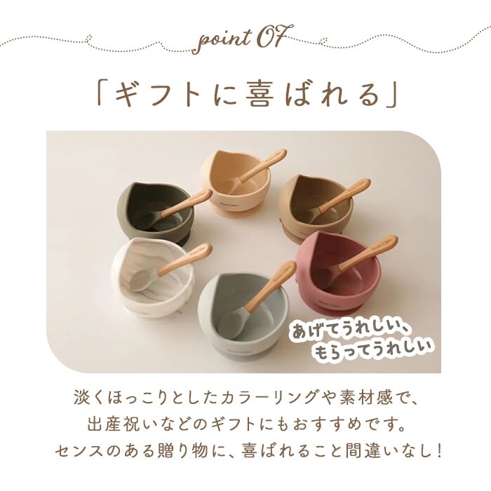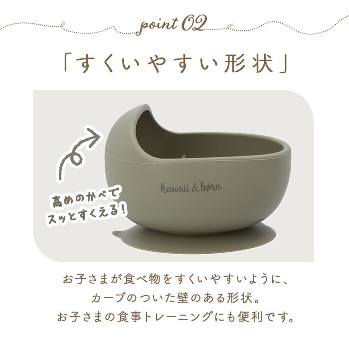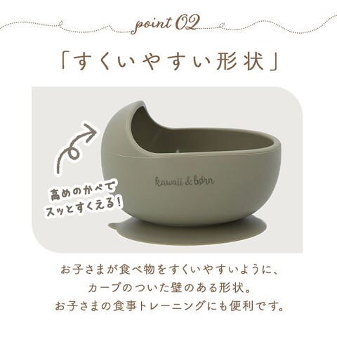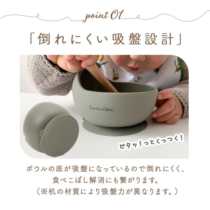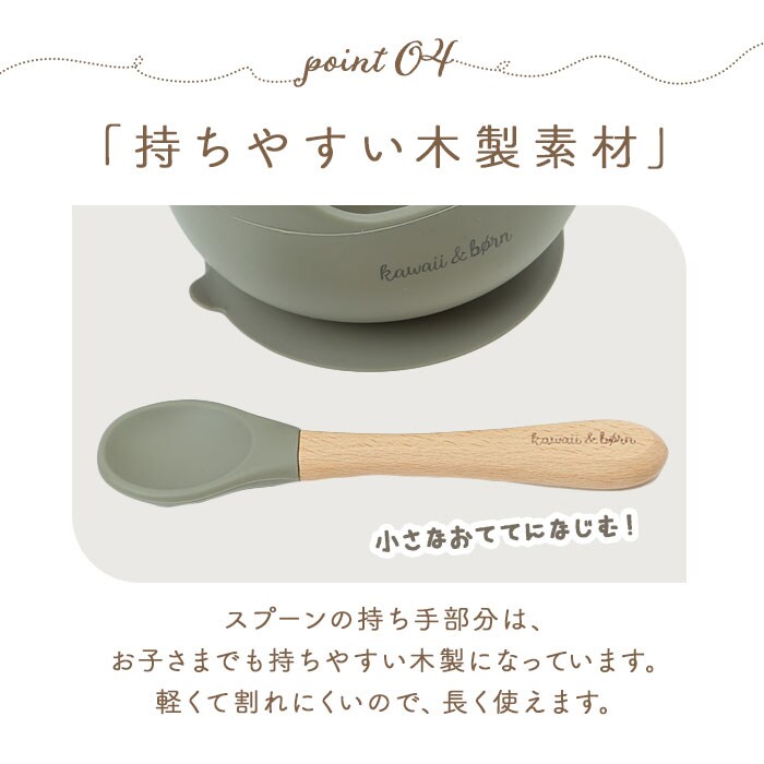 | 商品説明 | 離乳食や幼児食、お子さまのおやつを食べるときに便利♪kawaiiandbornのシリコンボウルandスプーンセット。食品検査に合格した安心安全のシリコン製で、パパ・ママも安心。ボウルの底が吸盤になっているので倒れにくく、食べこぼし解消にもつながる!(※机の材質により吸盤力が異なります。)さらにお子さまが食べ物をすくいやすい形状になっており、安心してお子さまのお食事トレーニングができちゃう◎スプーンの持ち手はお子さまでも持ちやすい木製。煮沸消毒・食洗機・電子レンジの使用OK!お手入れがラクラク、いつでも清潔に保てるのが嬉しい。お子さまが自分でご飯を食べる練習にぴったり。可愛らしいくすみカラーで、ギフトにもおすすめ♪ |