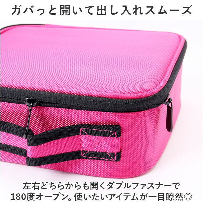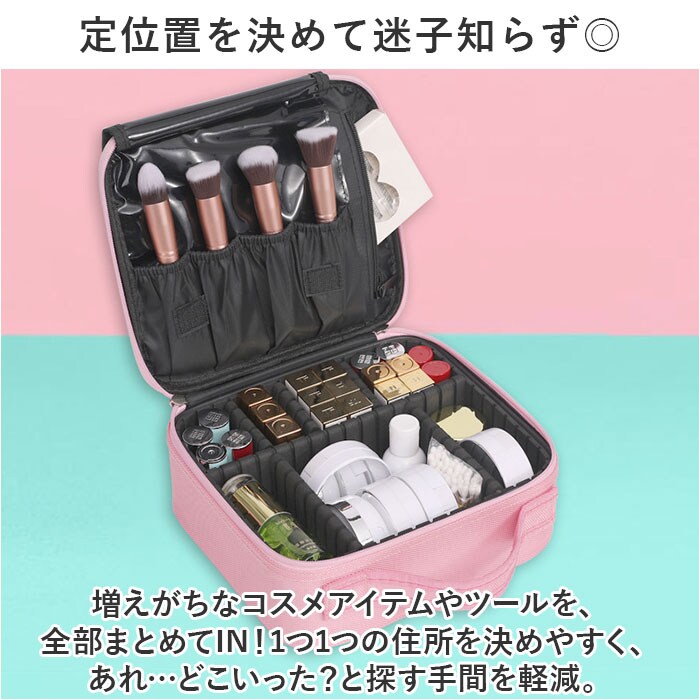| 商品説明 | メイクアイテムをひとまとめ♪ポケットと仕切り付きで整理整頓ラクラク!「メイクボックス」が新登場。【定位置を決めて迷子知らず◎】増えがちなコスメアイテムやツールを、全部まとめてIN!1つ1つの住所を決めやすく、あれ…どこいった?と探す手間を軽減。【ガバっと開いて出し入れスムーズ】左右どちらからも開くダブルファスナーで180度オープン。使いたいアイテムが一目瞭然◎【自分仕様にアレンジできる可動式】耐久性がありつつ傷付きを防ぐ仕様の仕切り付きスペース。仕切りはお好みの位置に変更でき、ちょこっと大きなパウダーやクッションファンデも収納OK。【ブラシなどのツールもすっきり】フタ裏4つのギャザーポケットには、ブラシ類を収納。面ファスナー式のフラップでこぼれ落ちや汚れをガード。小物が入るファスナーポケットも装備。【持ち運びがスマート&安心設計】上部に持ち手が付いており、移動や持ち運びも簡単。安定感ばっちりなボックス型&クッション材入りで衝撃を和らげて中身を保護。【長く愛用できるシンプルなつくり】使う人を選ばず飽きのこないシンプルな無地カラー。程よい収納力があり、大切に保管&持ち運びできる便利アイテム。 |