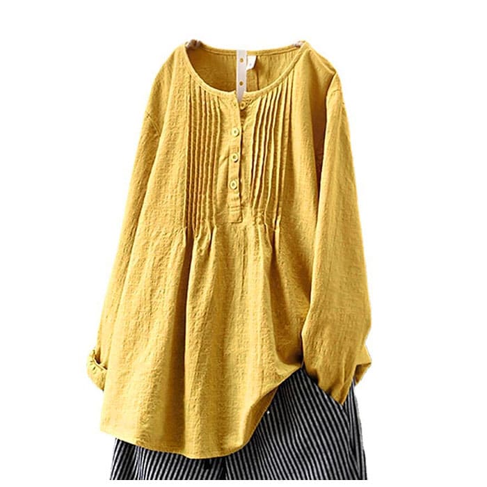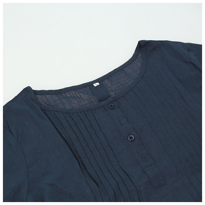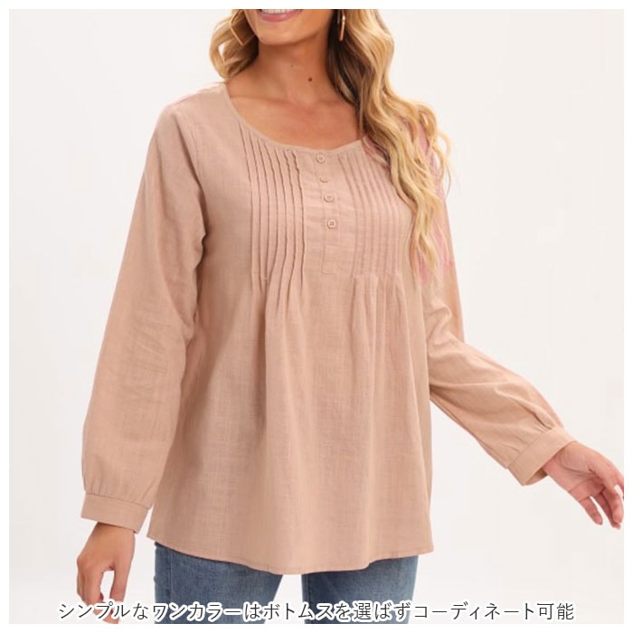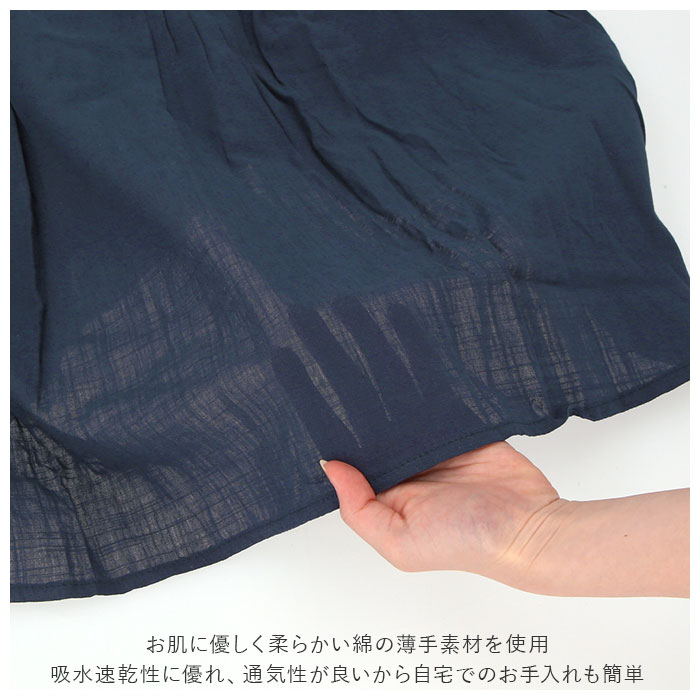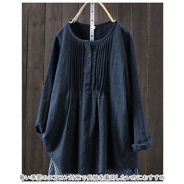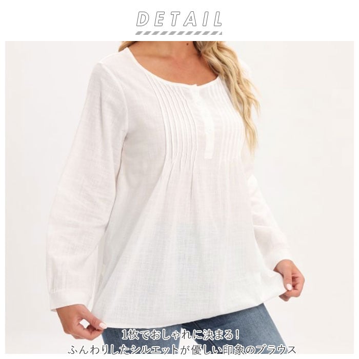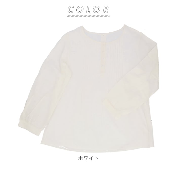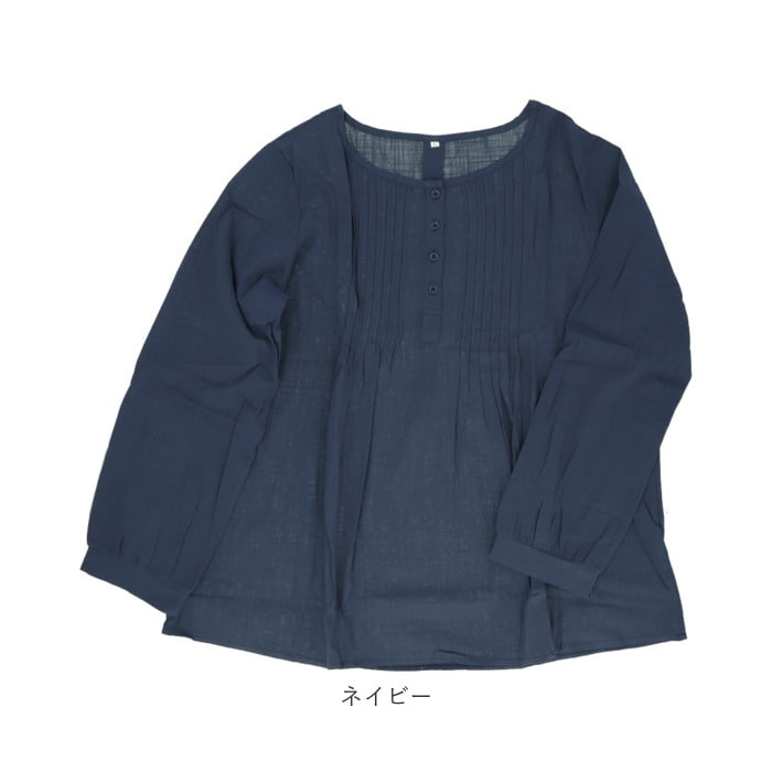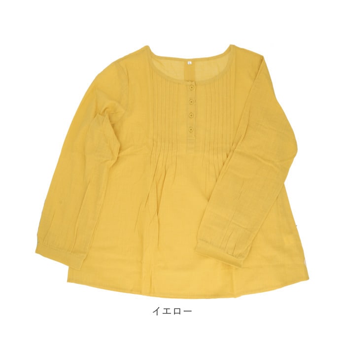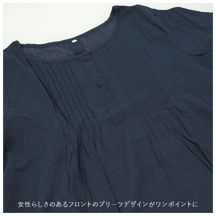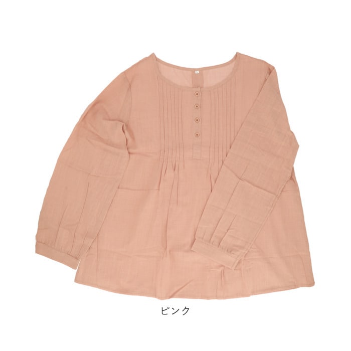 | 商品説明 | 1枚でおしゃれに決まる!ふんわりしたシルエットが優しい印象のブラウス。シンプルなワンカラーはボトムスを選ばずコーディネート可能。女性らしさのあるフロントのプリーツデザインがワンポイントに。お肌に優しく柔らかい綿の薄手素材を使用。吸水速乾性に優れ、通気性が良いから自宅でのお手入れも簡単。暑い季節のエアコン対策で長袖を着用したい方におすすめ。 |