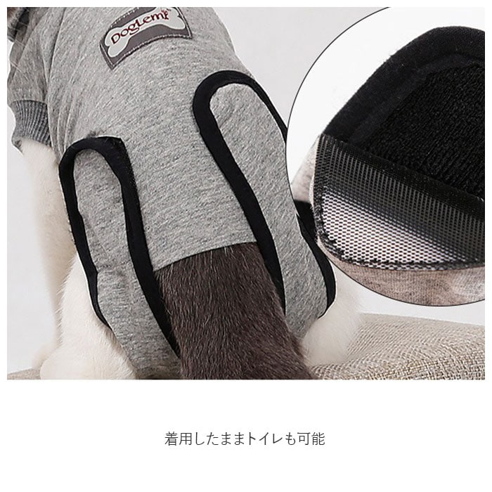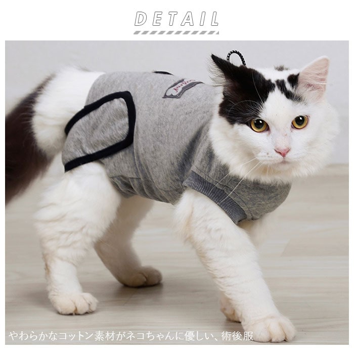 | 商品説明 | やわらかなコットン素材がネコちゃんに優しい、術後服。手術後や皮膚疾患の治療中のペットが、患部を舐めてしまったり、噛んでしまうことを防ぐお洋服。男の子も女の子も着用しやすい、グレーカラー!首まわりは、背面側のドローコードでサイズ調節が可能。パンツ部分は大きめの面ファスナーで開閉するデザイン。着用したままトイレも可能。手術後の傷口の保護だけでなく、アレルギーやアトピーなどお肌の弱いネコちゃんにもぴったり。 |