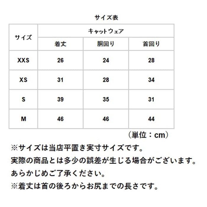 | サイズ | 【キャットウェア】 ・XXSサイズ ・XSサイズ ・Sサイズ ・Mサイズ ※サイズについて詳細は、サイズ表をご覧ください。 |