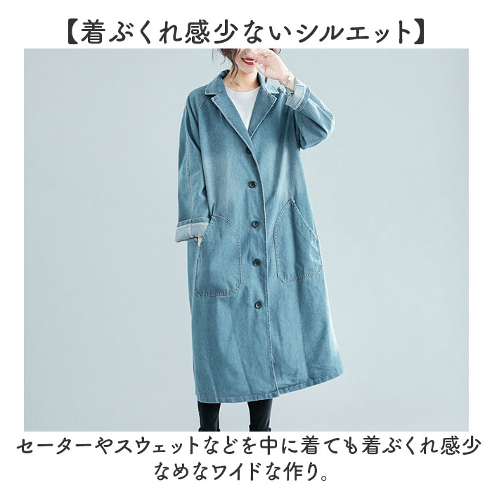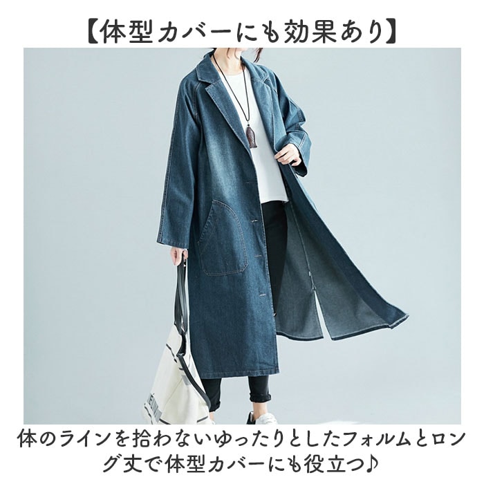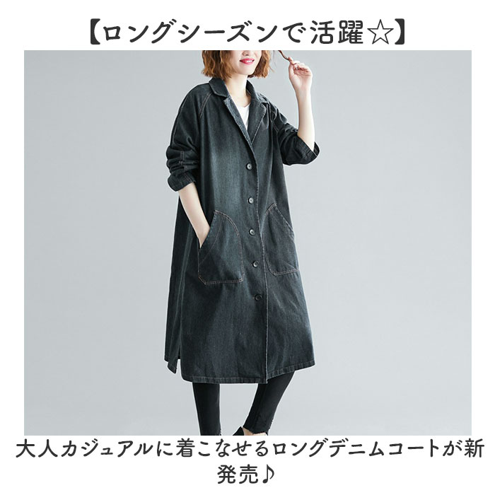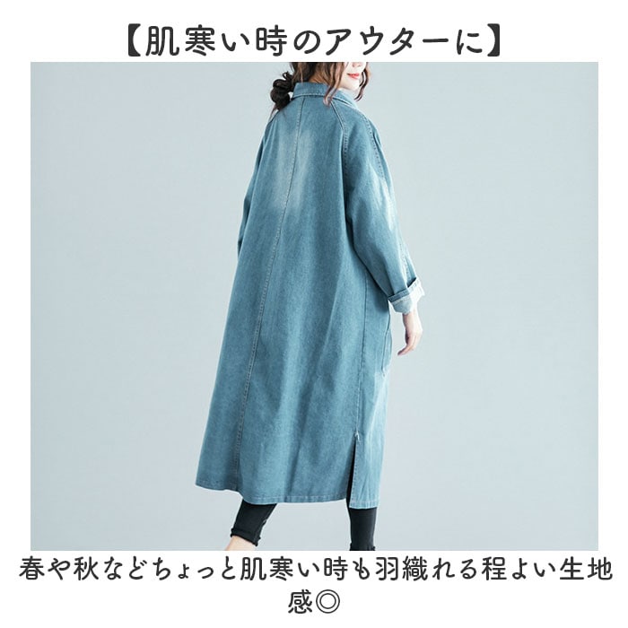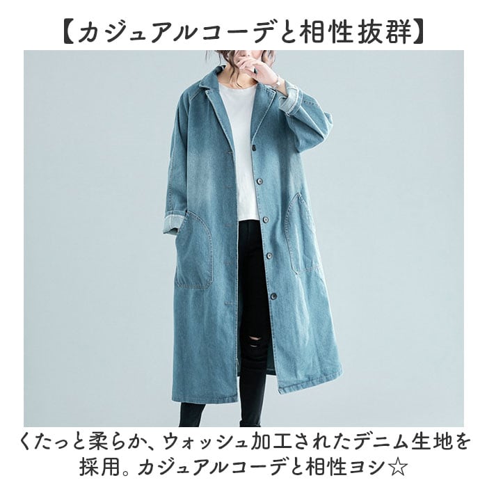 | 商品説明 | 【ロングシーズンで活躍☆】大人カジュアルに着こなせるロングデニムコートが新発売♪【カジュアルコーデと相性抜群】くたっと柔らか、ウォッシュ加工されたデニム生地を採用。カジュアルコーデと相性ヨシ☆【こなれ感をプラス】ウォッシュ加工による程よい色抜け感とヴィンテージ感がこなれ感をプラス。【肌寒い時のアウターに】春や秋などちょっと肌寒い時も羽織れる程よい生地感◎【着ぶくれ感少ないシルエット】セーターやスウェットなどを中に着ても着ぶくれ感少なめなワイドな作り。【体型カバーにも効果あり】体のラインを拾わないゆったりとしたフォルムとロング丈で体型カバーにも役立つ♪【便利なポケット】アクセントにもなる大きなポケットはスマホやハンカチを入れるのに最適☆ |