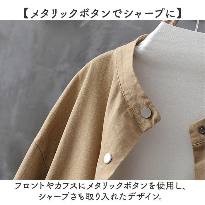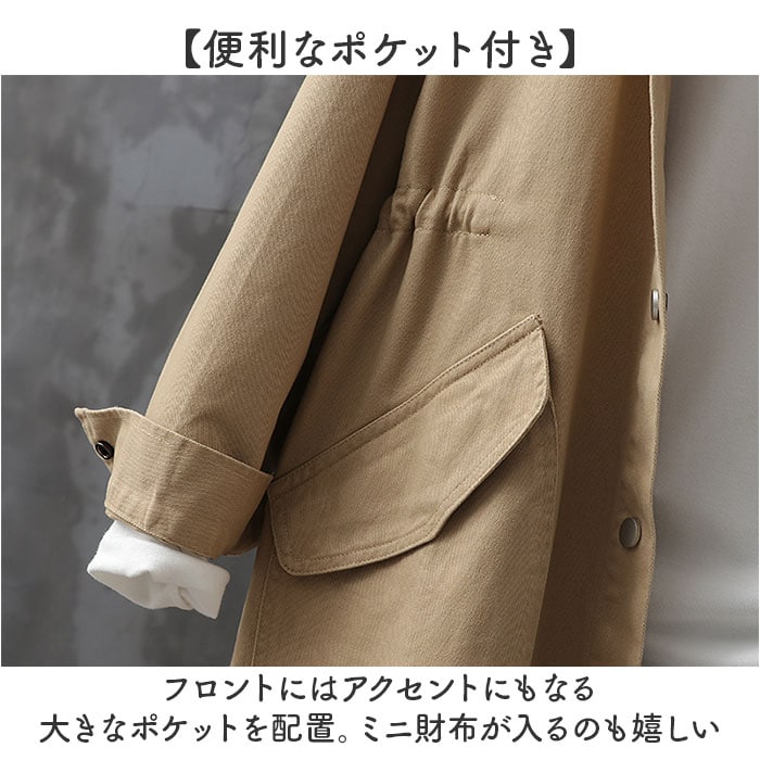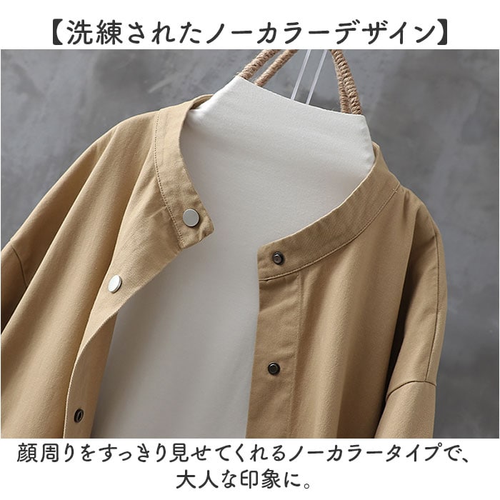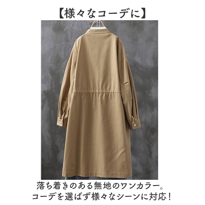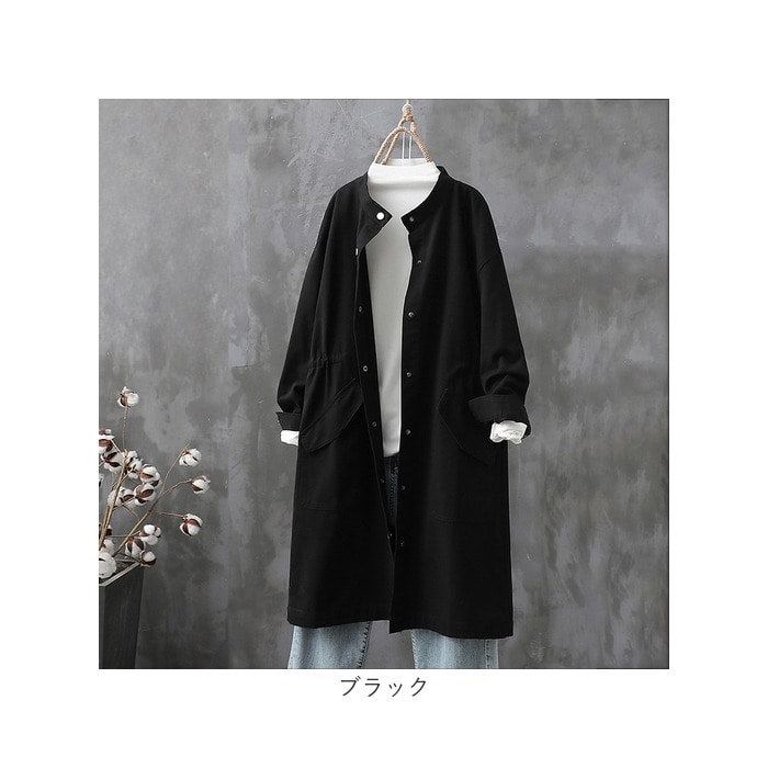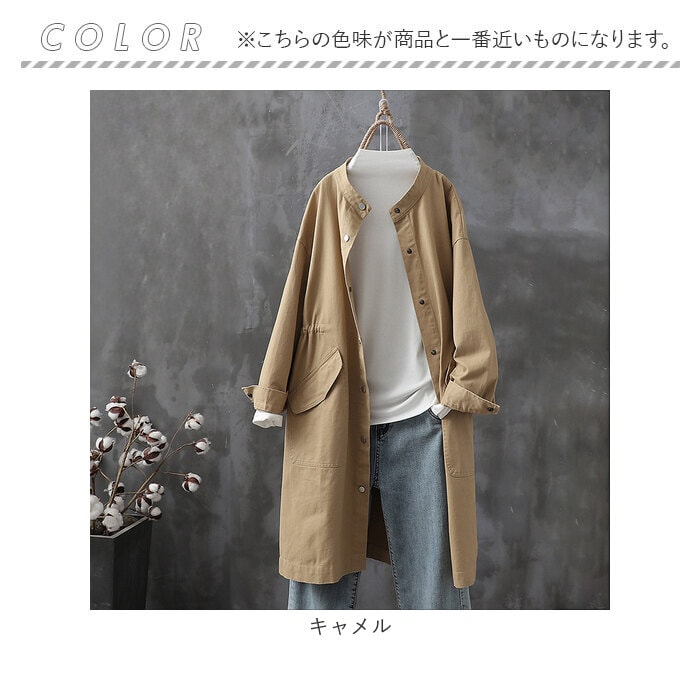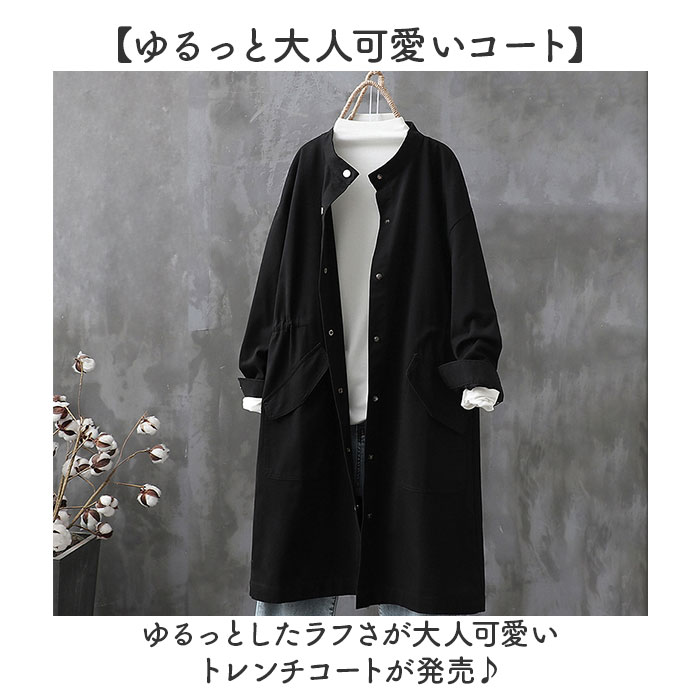 | 商品説明 | 【ゆるっと大人可愛いコート】ゆるっとしたラフさが大人可愛いトレンチコートが発売♪【洗練されたノーカラーデザイン】顔周りをすっきり見せてくれるノーカラータイプで、大人な印象に。【様々なコーデに】落ち着きのある無地のワンカラー。コーデを選ばず様々なシーンに対応!【メタリックボタンでシャープに】フロントやカフスにメタリックボタンを使用し、シャープさも取り入れたデザイン。【すっきりとしたシルエット】ウエストマークにギャザー寄せを取り入れ、すっきりとした仕上がりに。【春や秋のお出かけにピッタリ】程よい生地感で少し肌寒い春や秋のアウターに最適☆【便利なポケット付き】フロントにはアクセントにもなる大きなポケットを配置。ミニ財布が入るのも嬉しい |