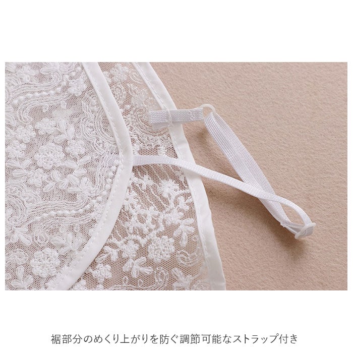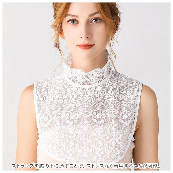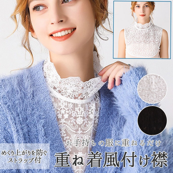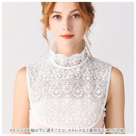 | 商品説明 | 重ね着風の「付け襟」が新登場♪お手持ちの服に重ねるだけで、手軽にレイヤードスタイルを楽しめて、お洒落度アップ!裾部分のめくり上がりを防ぐ調節可能なストラップ付き。ストラップを脇の下に通すことで、ストレスなく着用することが可能。華やかなレースと程よい透け感が大人っぽいデザイン♪洗濯しづらいアウターに重ねることで汚れ防止にも。 |
