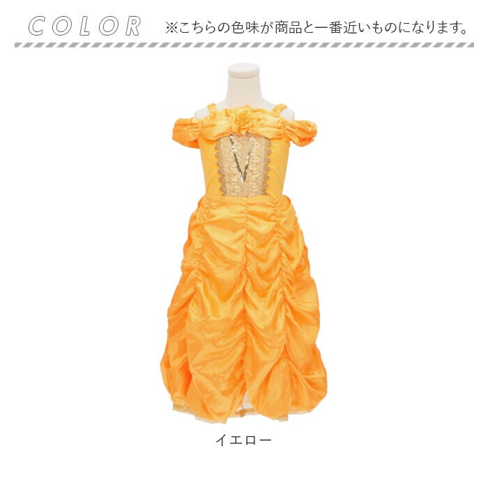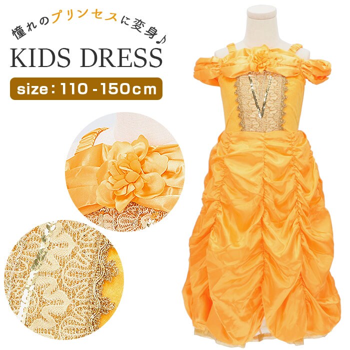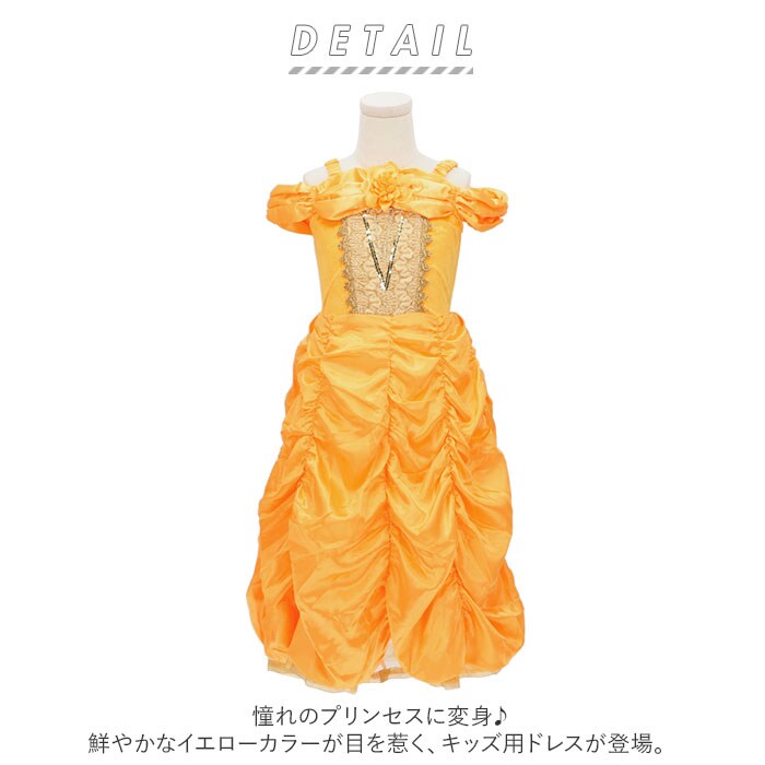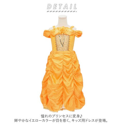 | 商品説明 | 憧れのプリンセスに変身♪鮮やかなイエローカラーが目を惹く、キッズ用ドレスが登場。女の子の夢をぎゅっと詰め込んだプリンセスデザイン♪刺繍デザインとたっぷりのドレープが、ゴージャスな雰囲気を演出。胸元のコサージュもアクセント!(※取り外しはできません。)頭から被るだけだから、お子さまでも脱ぎ着がラクラク!お手持ちのパニエを仕込んで、ボリューム感をプラスしてもOK。(※パニエを着用しない場合、ボリューム感が少なめなデザインとなります。)お子さまの誕生日など、特別な日の1着におすすめ★ハロウィンの仮装など、イベントでも大活躍。 |
