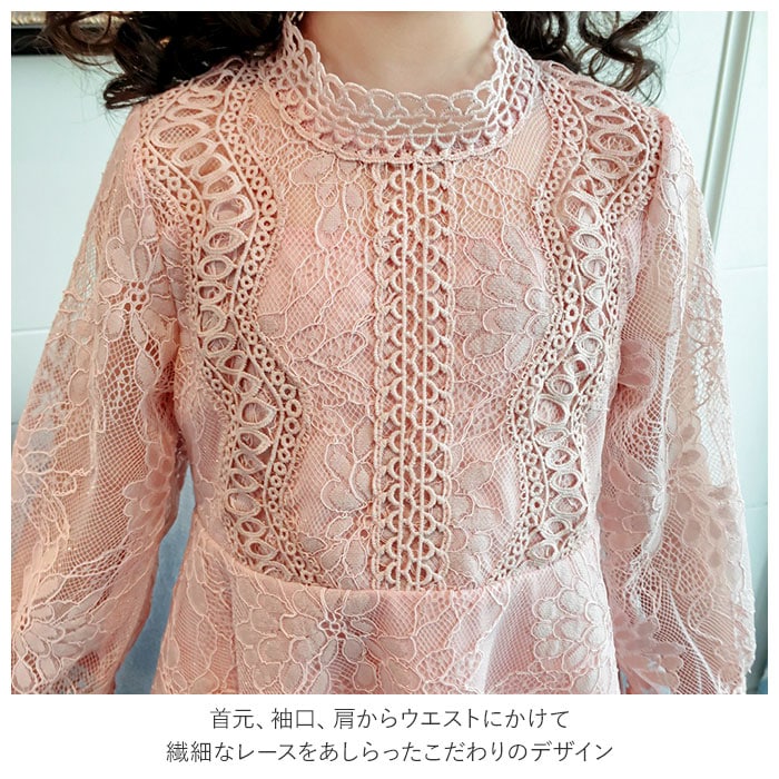 | 商品説明 | 総レース仕立てがエレガントなキッズワンピース♪首元、袖口、肩からウエストにかけて繊細なレースをあしらったこだわりのデザイン。着脱はファスナー式。長め設計で着脱しやすい◎胸元から裾にかけて安心の裏地付き。発表会や結婚式のお呼ばれなど、フォーマルシーンにぴったり! |