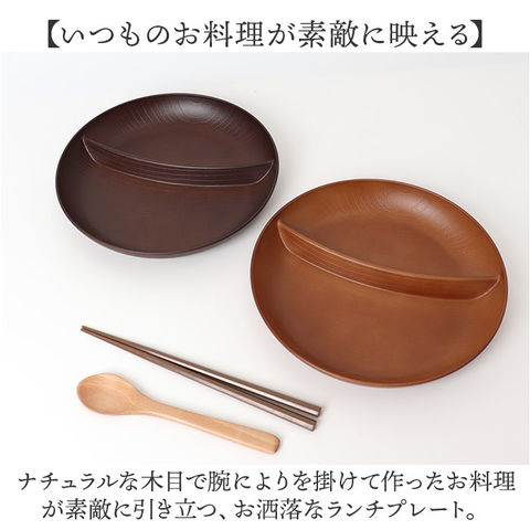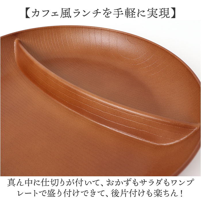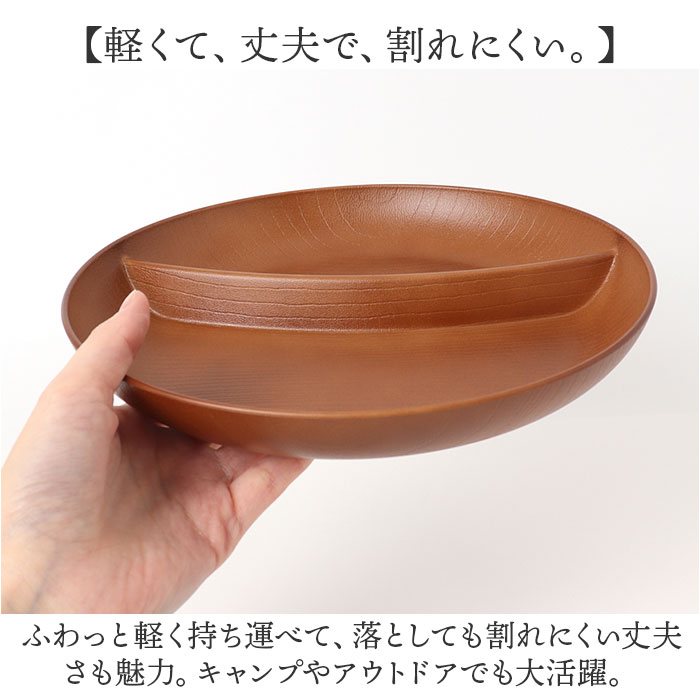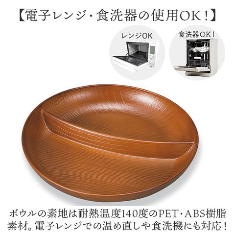 | 商品説明 | 【手軽におうちでカフェ気分♪】まるで欅のような優しい木肌が“おうち時間”を美味しく彩る・・・。「欅杢目サークルプレート」【いつものお料理が素敵に映える】ナチュラルな木目で腕によりを掛けて作ったお料理が素敵に引き立つ、お洒落なランチプレート。【カフェ風ランチを手軽に実現】真ん中に仕切りが付いて、おかずもサラダもワンプレートで盛り付けできて、後片付けも楽ちん!【スープやソースが混ざらない♪】2つの仕切りには深さがあり、カレーやスープハンバーグなど汁気のあるおかずもキレイに盛れる♪【電子レンジ・食洗器の使用OK!】ボウルの素地は耐熱温度140度のPET・ABS樹脂素材。電子レンジでの温め直しや食洗機にも対応!【軽くて、丈夫で、割れにくい。】ふわっと軽く持ち運べて、落としても割れにくい丈夫さも魅力。キャンプやアウトドアでも大活躍。【スタッキングで省スペース】同じサイズのプレートを積み重ねてすっきりと収納可能。食器棚でも場所を取らずに省スペース♪【伝統が息づく、安心の日本製品】温かみのある木目調の塗装は、樹脂製の素地に石川県加賀市・山中温泉地区に伝わる塗装技法「山中塗り」を施したもの。安心のMade in Japan製品。【About Natule ーナチュール-】いつでもお家でカフェ気分が味わえる、ナチュラルで使いやすい木目風のテーブルウェア。季節の食材を盛り付けて、素敵なランチが演出できるのはもちろん、夜ごはんもおやつの時間も大活躍。 |